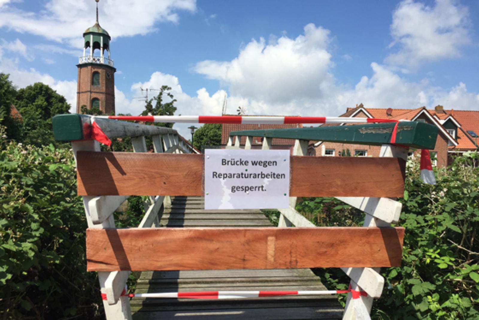 Die Fußgängerbrücke über das Sieltief in Ditzum ist seit rund sechs Wochen gesperrt - und dieser Zustand wird noch länger andauern. »Das wird noch Zeit kosten, so ärgerlich es auch ist«, sagte gestern Bürgermeister Johann ...