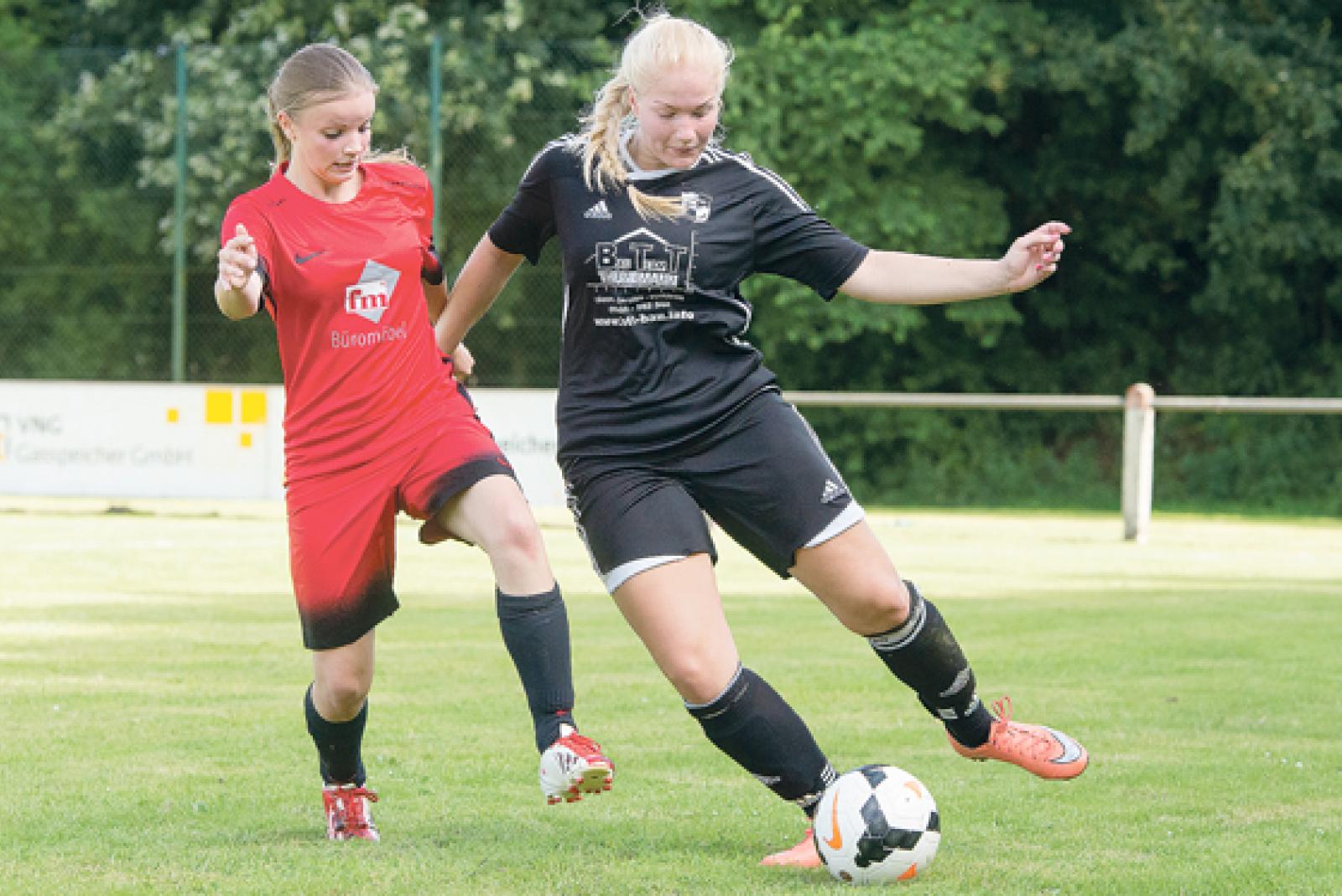 Keinem Zweikampf ging Jemgums Frauke Schröder (l.) aus dem Weg. Hier stört sie Alexandra Schulte. © Foto: Mentrup