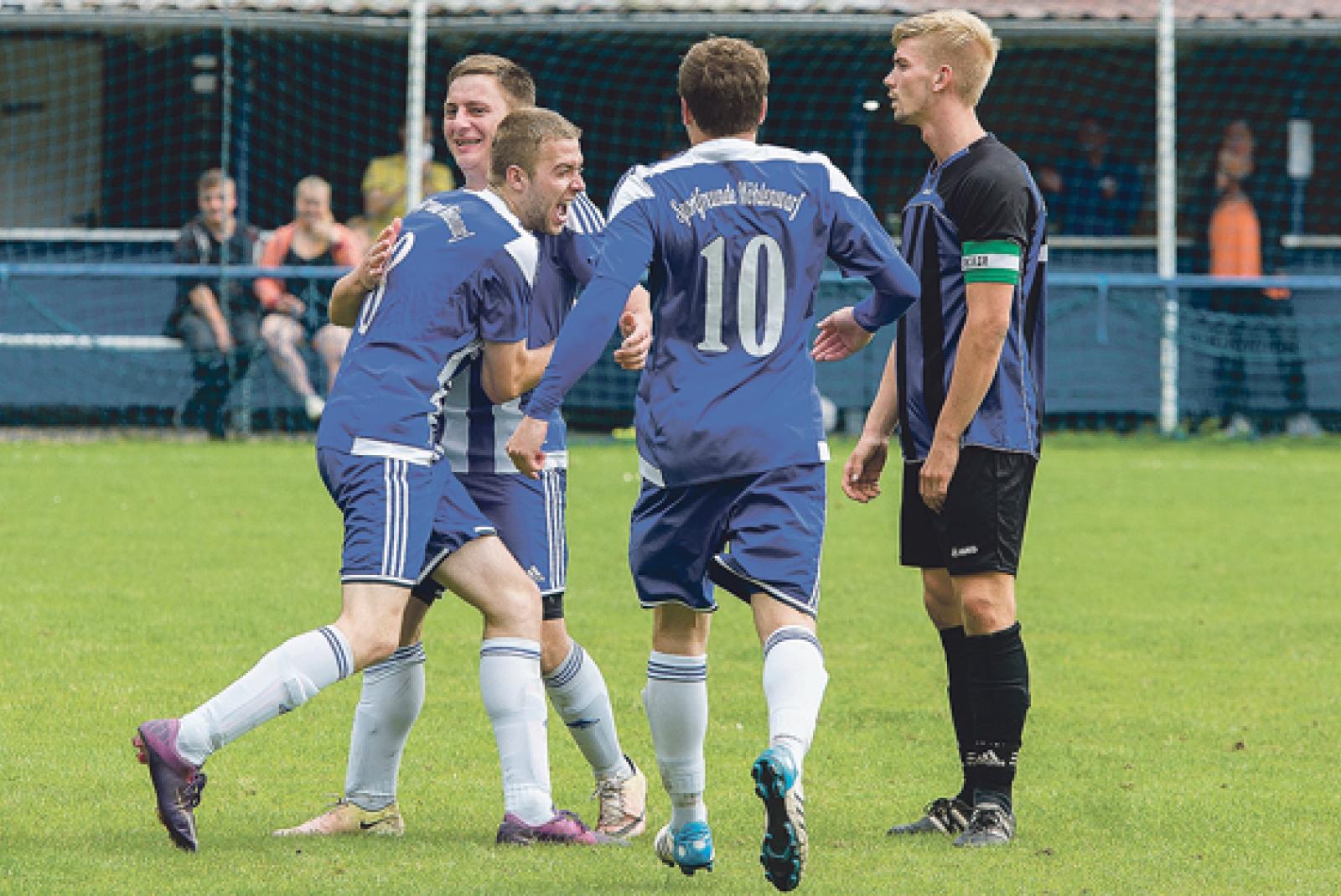 Seine Freude über Marc Kitzerows 4:0 schreit Ino Sanders heraus. Christopher Schielicke eilt hinzu, während Leers Kapitän Thomas Schmidt konsterniert ist. © Foto: Mentrup