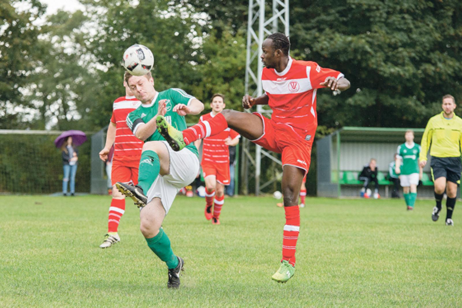 Zuerst am Ball ist Bundes Sarakay Ouattara im Zweikampf mit dem Stapelmoorer Torschützen Thorsten Rieks. Im umkämpften Derby behielten am Ende die Gäste die Oberhand. © Foto: Mentrup