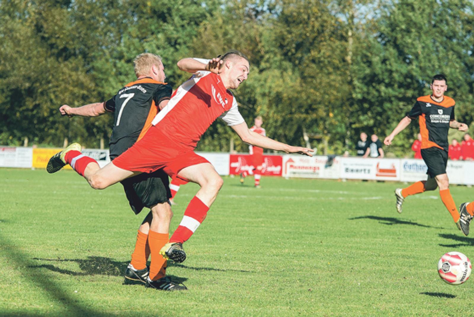 Hier zwar gestoppt, aber die Jemgumer um Aaron Mansholt ließen sich von den Wymeerstern um Nils Huisinga nicht aus dem Tritt bringen. © Foto: Bruins