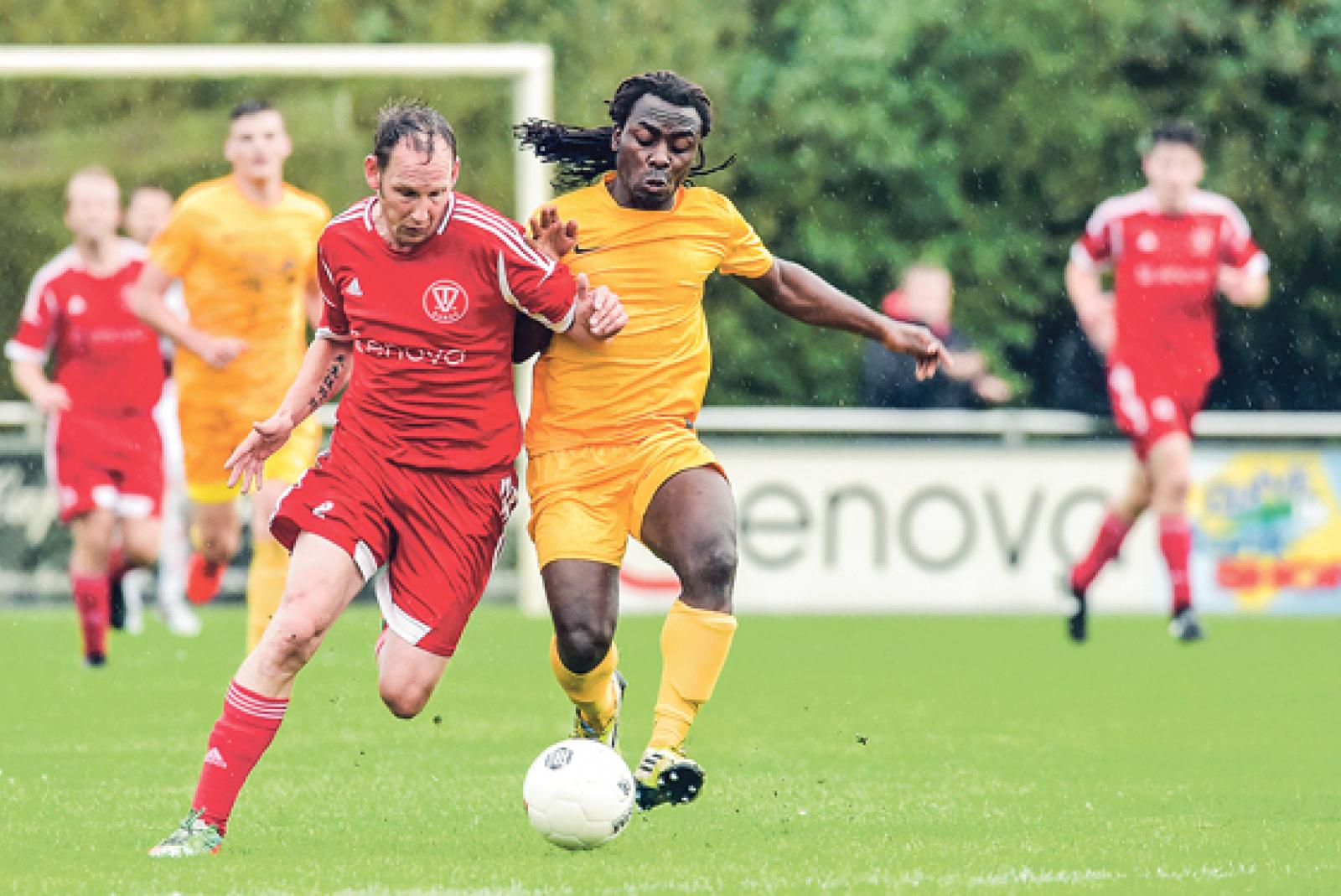 Nicht stoppen lassen wollen sich die Bunder um Stefan Eling (hier gegen Germania Leers Enock Maguru) im Heimspiel gegen Concordia Ihrhove. © Foto: Bruins