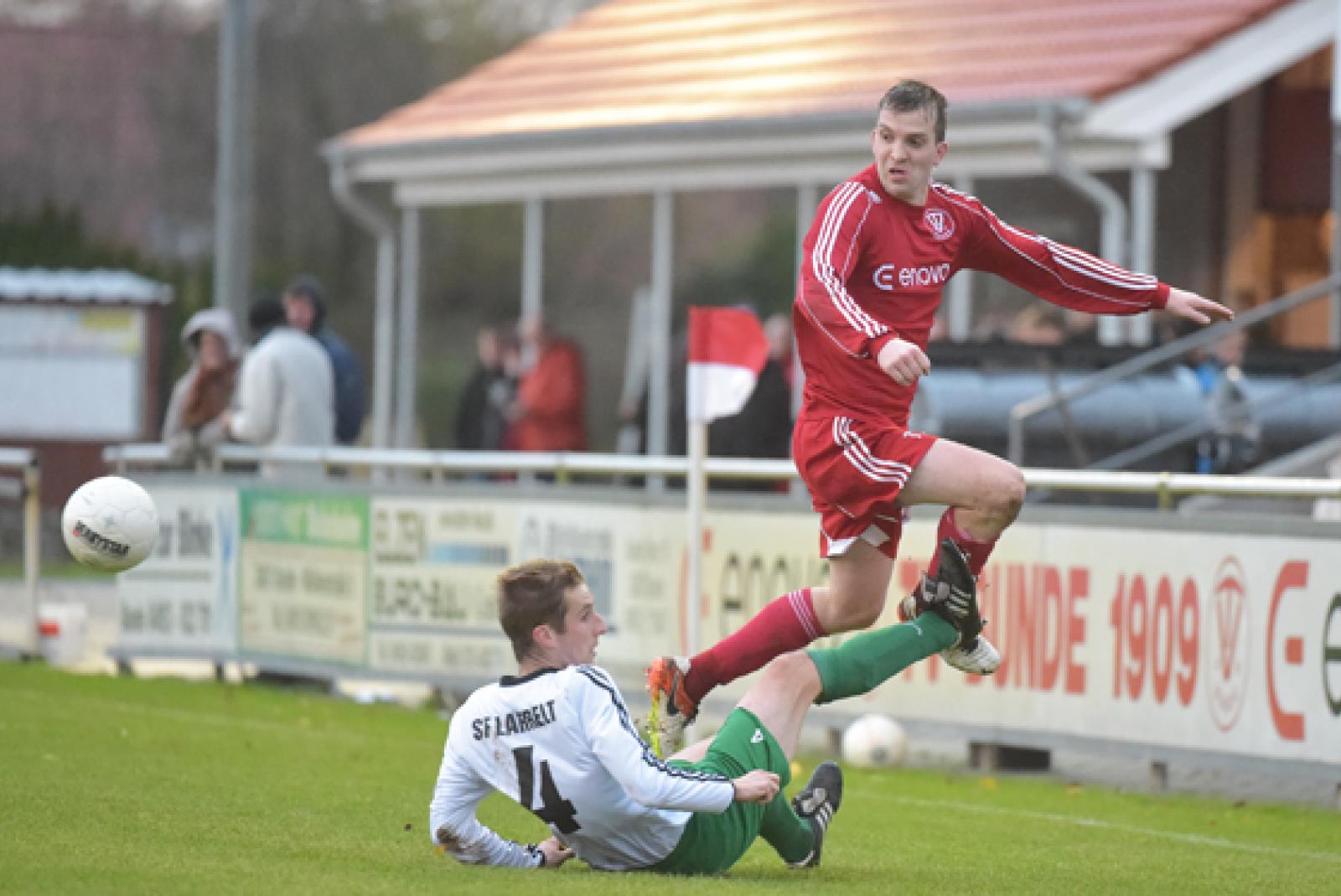 Leichtfüßig lässt Volker Wirtjes seinen Gegenspieler Marcus Meiners ins Leere grätschen. © Foto: Bruins