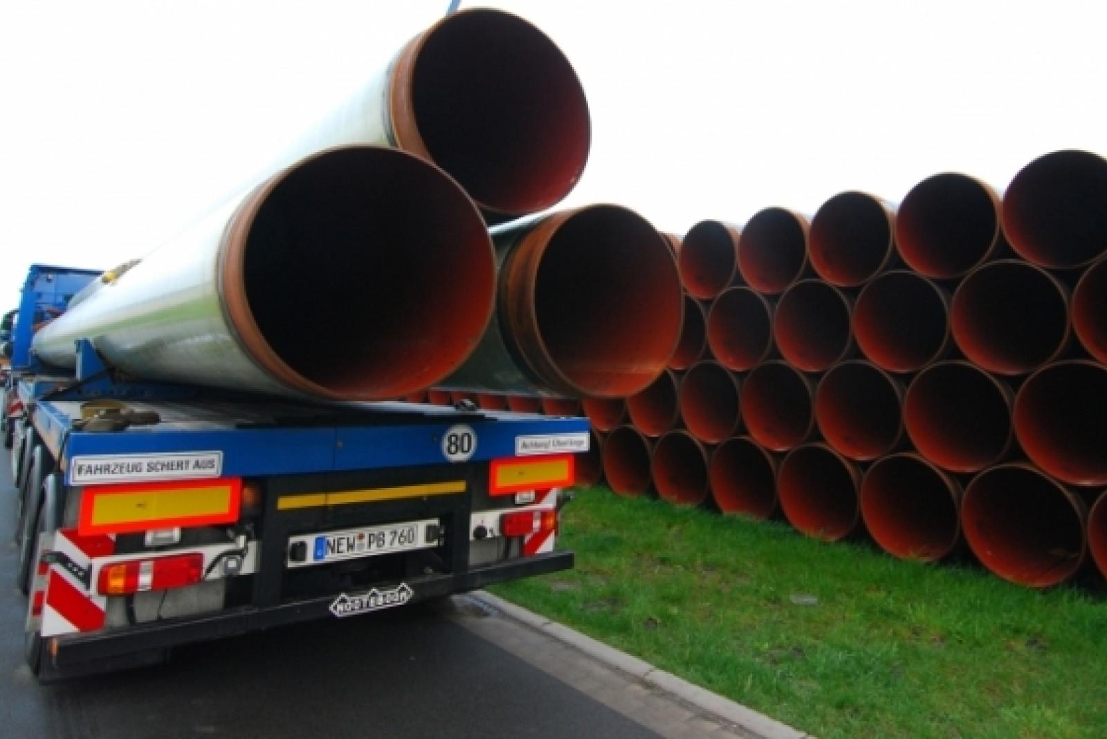 Rohr frei: Die ersten Pipeline-Stücke aus dem Sammellager im Gewerbegebiet Bunde-West werden auf Sattelzüge verladen und zu den Baustellen gebracht.  © Hanken
