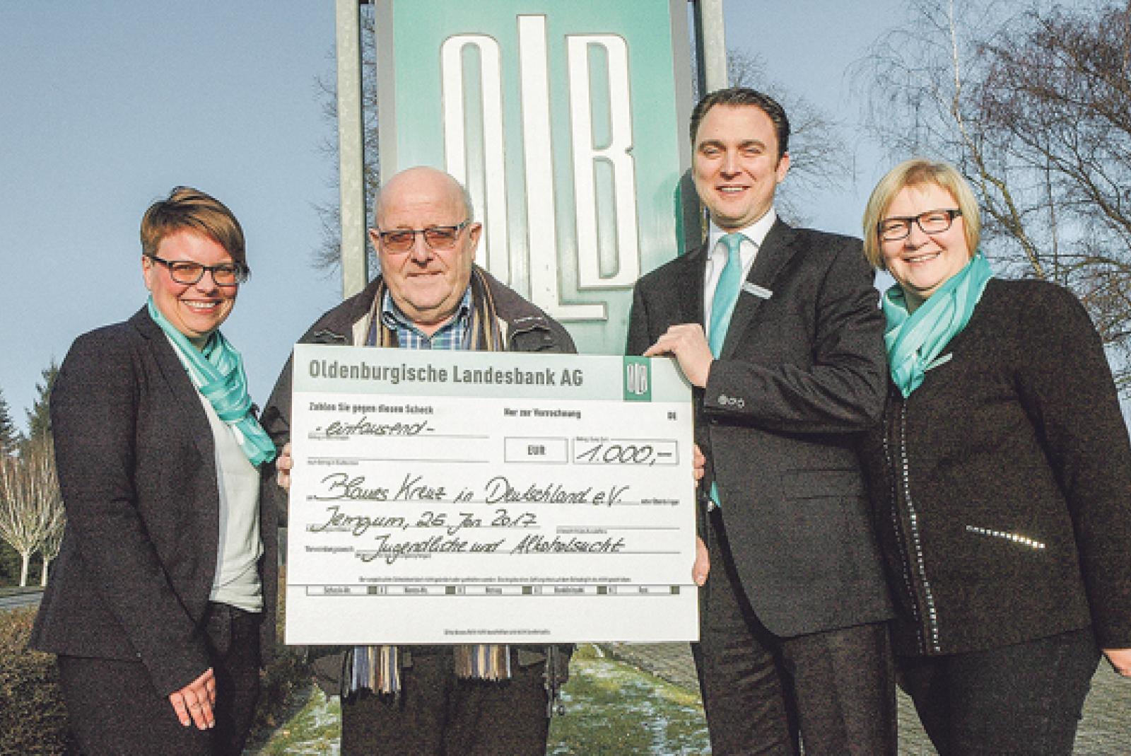 Mit einer Spende in Höhe von 1000 Euro unterstützt die Oldenburgische Landesbank (OLB) das Präventionsprojekt »Jugendliche und Alkohol(sucht)«, das von der Ortsgruppe Jemgum des christlichen Suchthilfeverbands »Blaues Kreuz« auf die Beine gestellt wird.