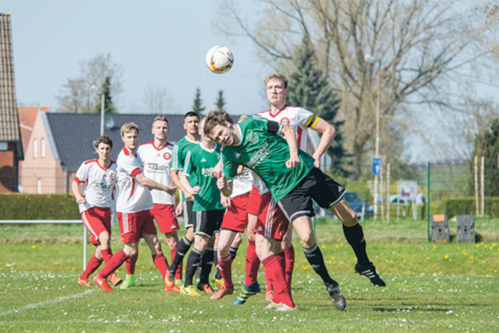In Schieflage geriet Kapitän Henning Albers nicht nur in diesem Kopfballduell - das gesamte Bingumer Spiel war sehr schwach. © Foto: Mentrup