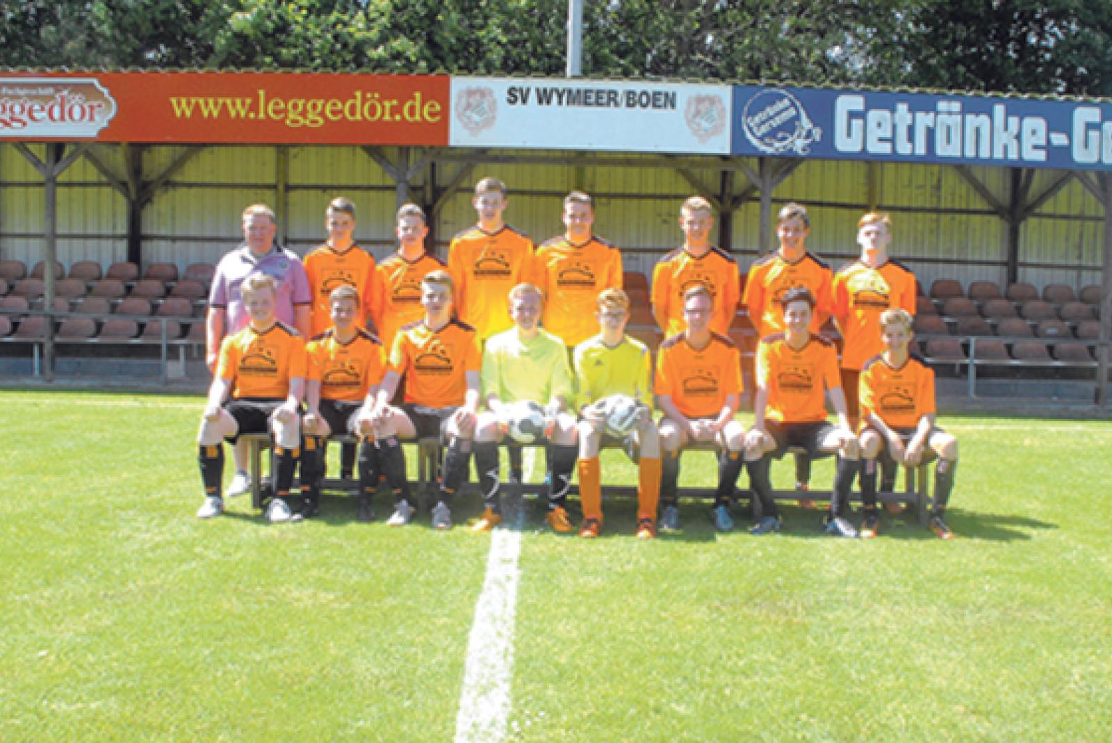Meister der Ostfrieslandklasse A sind die B-Junioren des SV Wymeer-Boen um (hinten von links) Trainer Heinz Smeenge, Domenik Bosma, Markus Buß, Ihno Frieling, Timo Blaauw, Malte Maas, Steffen Tergast, Mathis Wischeropp, (unten v. l.) Niklas Klaaßen, Ole Klipsch, Mathias Smid, Patrick Smeenge, Sven Wagner, Lars Weber, Lukas Neumann und Simon Koop.. © Foto: privat