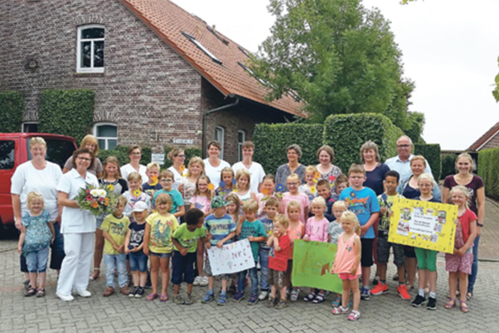 Ditzumer Kinder bedanken sich bei Zahnärztin mit Blumen und Plakaten