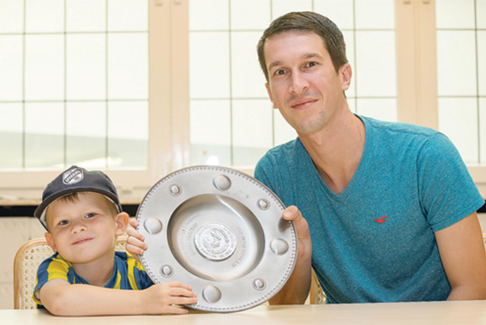 Erinnerungsstück an den größten Triumph: Stefan Suhlmann und Sohn Jonte mit dem Meisterteller von 2009. © Foto: Mentrup
