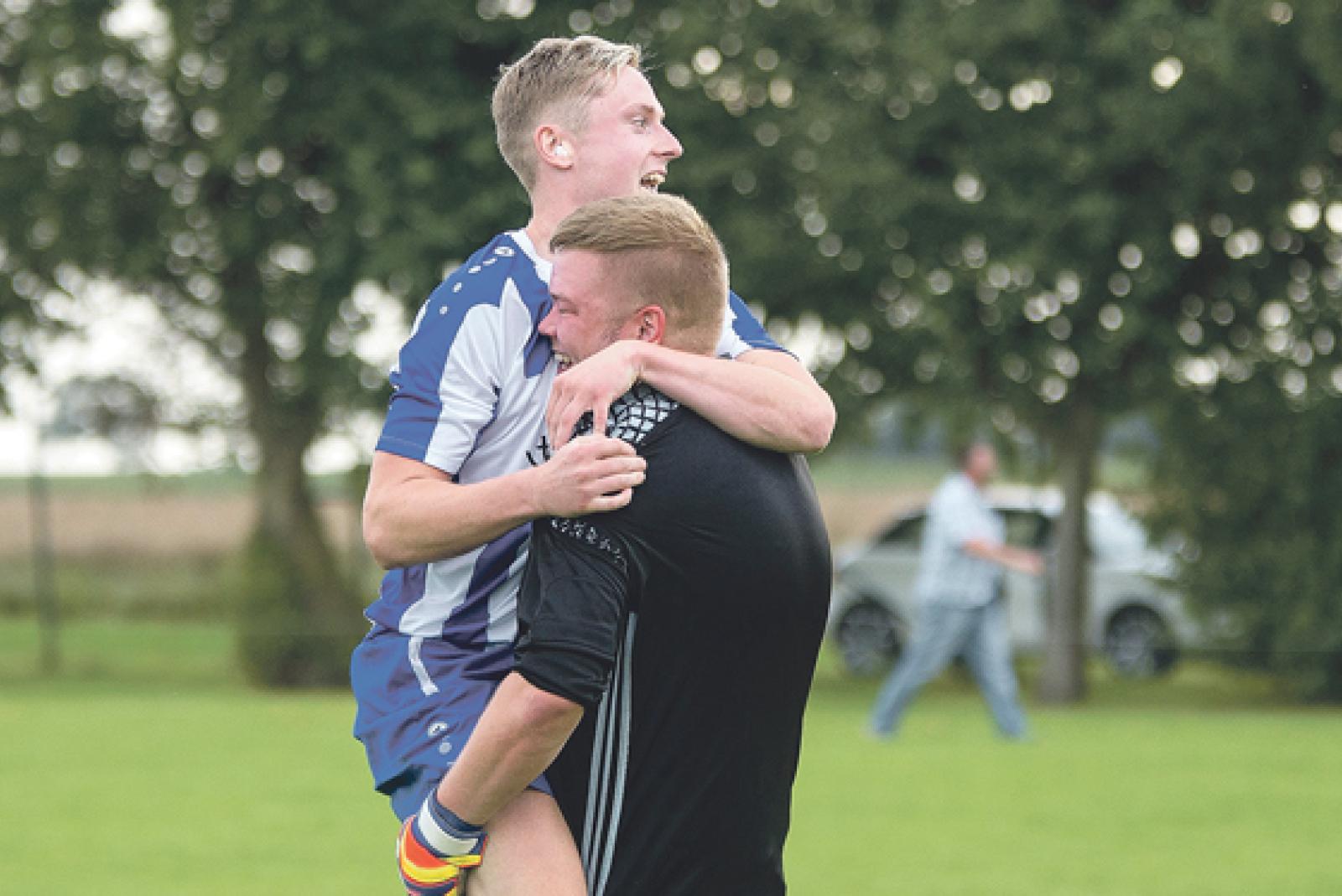 Möhlenwarfer Freude: Alexander Meyer und Torhüter Carsten Winterboer feiern den Einzug ins Halbfinale. © Foto: Mentrup