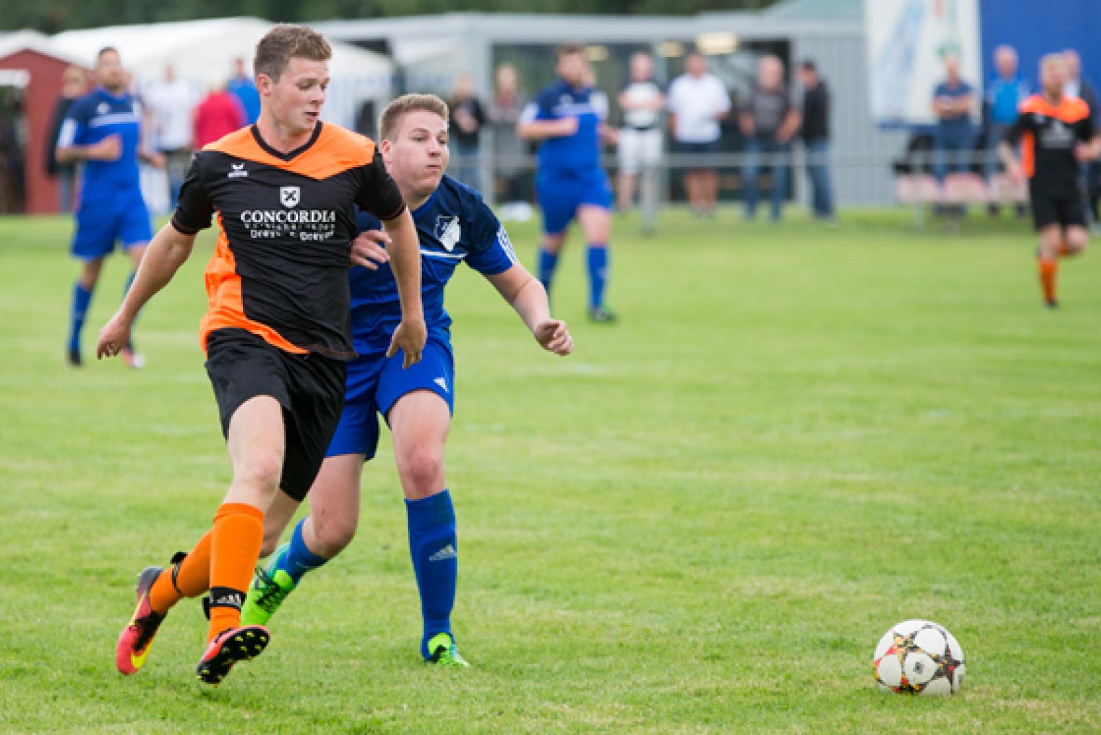 Wymeers Marco Dreesmann - hier im Zweikampf mit Marvin Buß von der SG Ditzum/Ditzumerverlaat I, brach sich beim Rheiderland-Pokal den Oberarm. © Foto: Mentrup