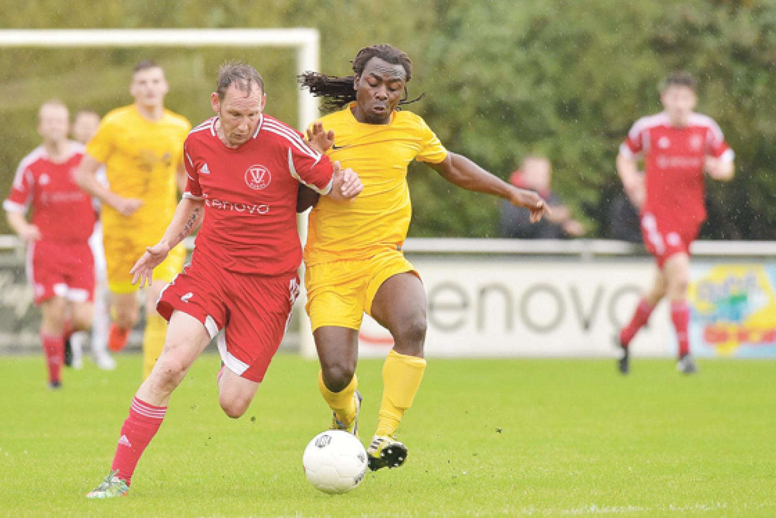 Einen echten Pokalfight wollen die Bunder um Stephan Eling (links) dem VfL Germania Leer mit Enock Maguru heute Abend liefern. © Foto: Bruins