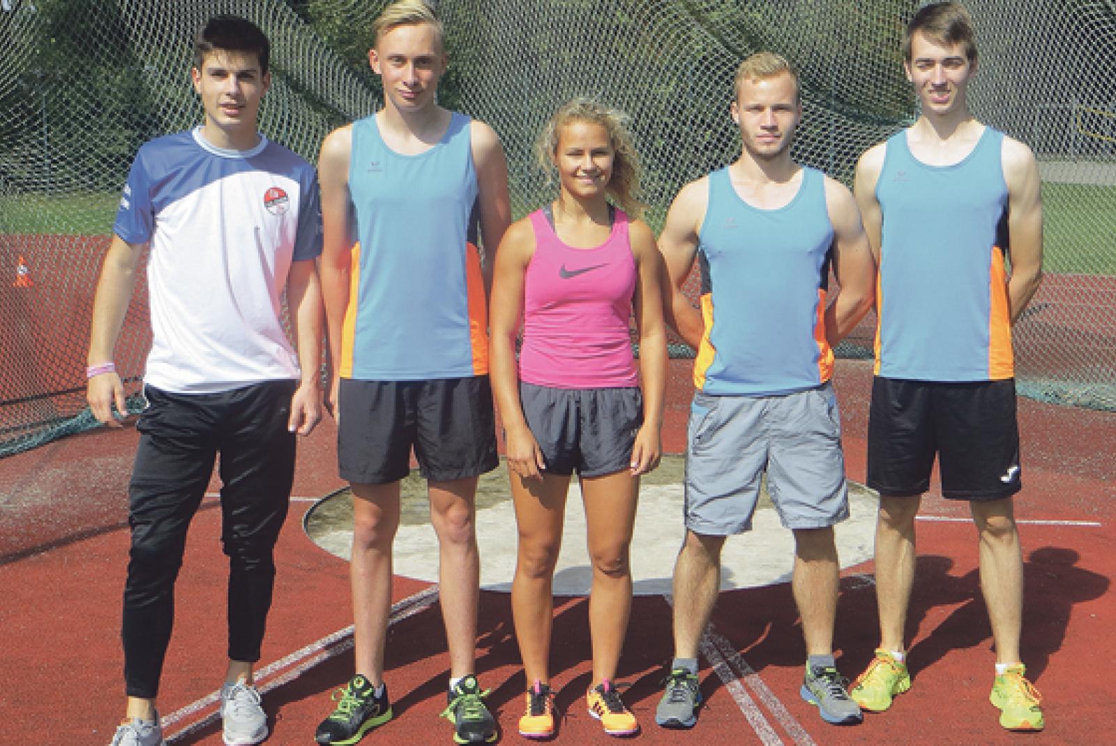 Die fünf Leichtathleten des TuS Weener um Anthony Göhrke, Jannes Smid, Deike Bornemann, Henning Kruse und Torben Veenhuis (von links) zeigten allesamt gute Leistungen bei den Grenzlandspielen. © Foto: Knoche