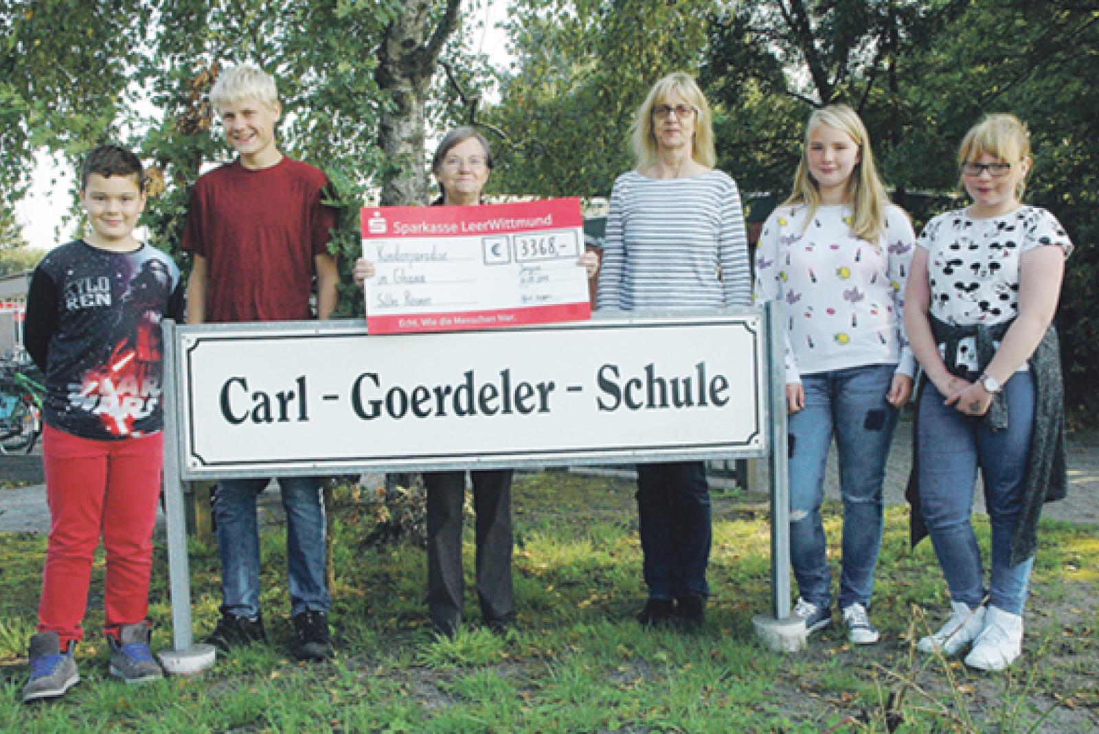 Dieses Engagement hat Tradition. Seit 2004 spendet die Carl-Goerdeler-Schule in Jemgum alljährlich für das »Kinder Paradise«, das die Rheiderländerin Silke Rösner im westafrikanischen Ghana aufgebaut hat. Gestern war wieder »Zahltag«: Schulleiterin Griet Leggeri übergab zusammen mit einigen ...