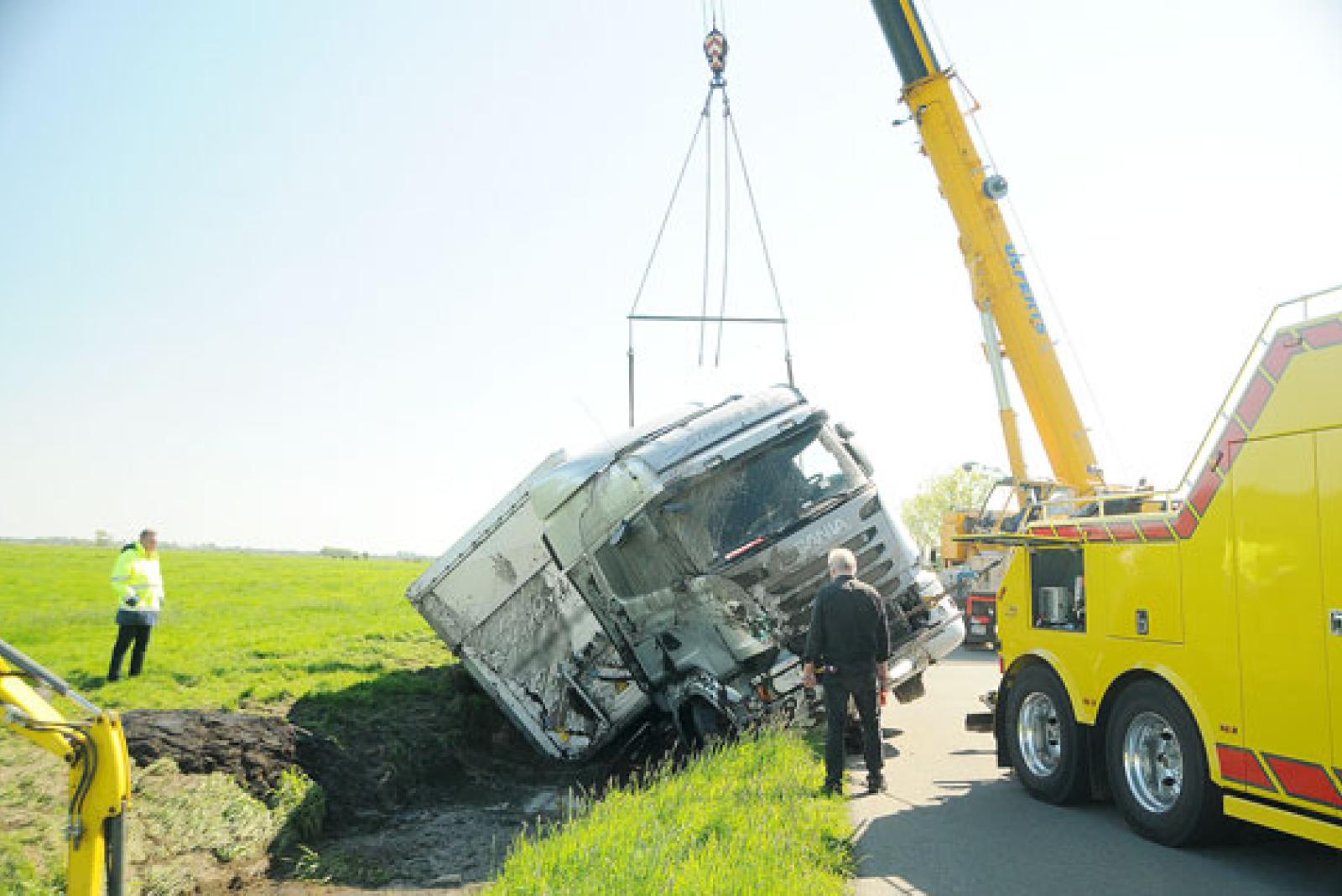 Sattelzug mit Kran aus Graben geholt