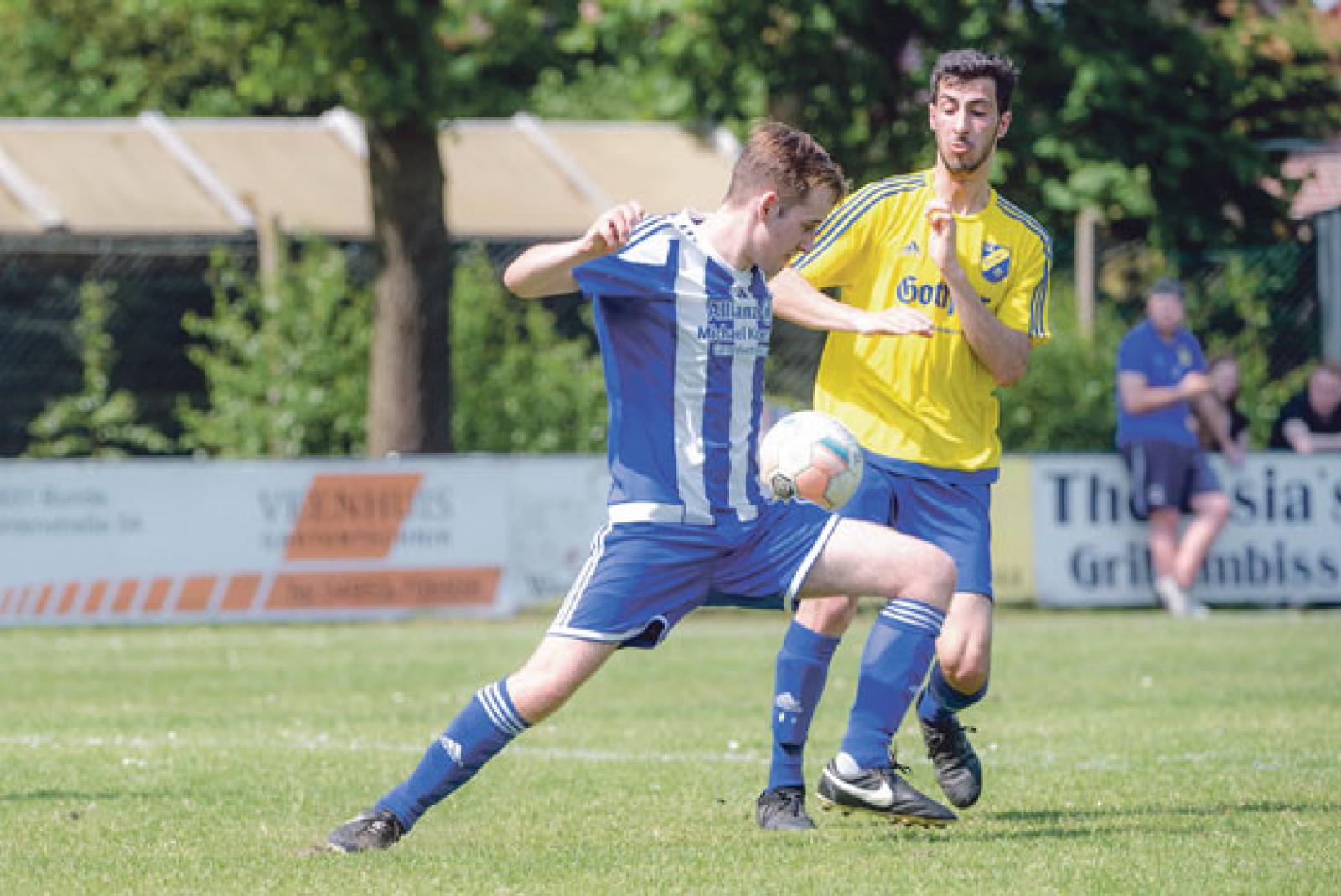 Der zweiten Herrenmannschaft der Möhlenwarfer um Timo Aikens gelang gegen dem TuS Weener II um Hassan Shakir ein 2:1-Derbysieg. © Foto: Bruins