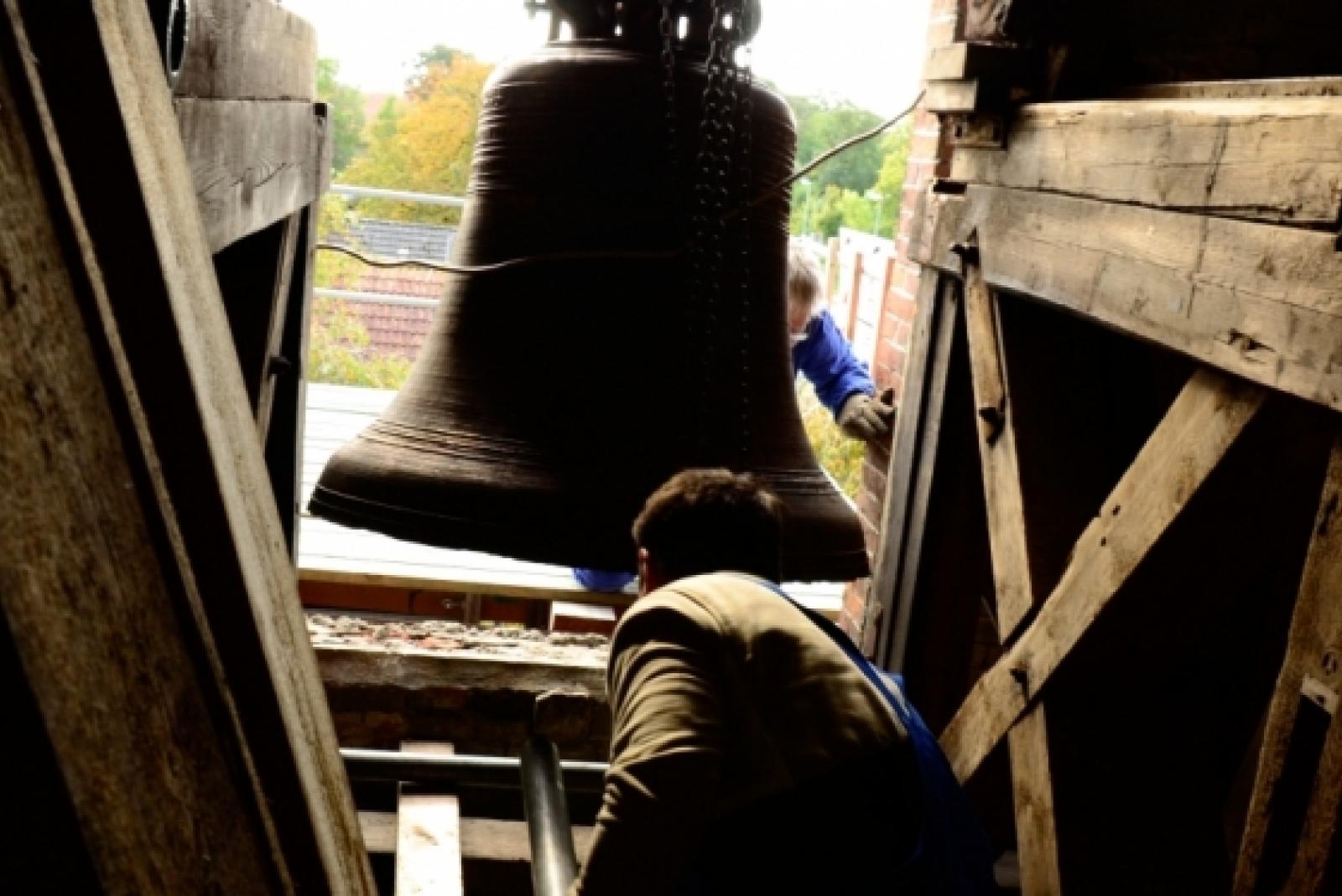Glocke nach langer Reparaturzeit wieder in Kirche eingesetzt