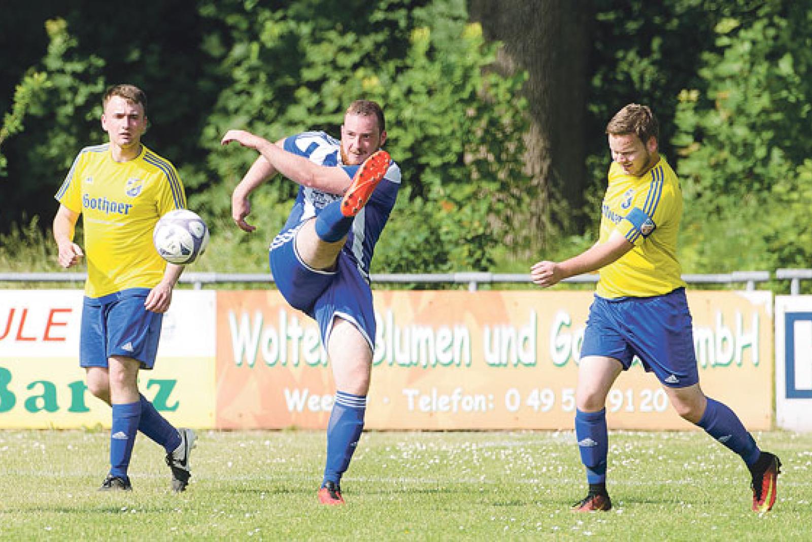 Die Sportfreunde um Marc Ostendorp scheinen Schüsse trainiert zu haben. Immerhin erzielten sie gegen TuS Weener II um Andre Bloem (links) und Timo Gersema zwei sehenswerte Treffer. © Fotos: Bruins
