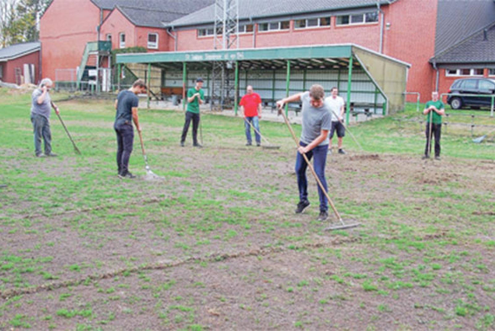 Die Hitze des »Jahrhundertsommers« hat auf den Sportanlagen in Stapelmoor deutliche Spuren hinterlassen. Der Vereinsvorsitzende Herbert Waltemathe (rotes T-Shirt) setzte ein ?Zeichen für eine Neueinsaat. Fußballobmann Manfred van Essen koordinierte den Spielplan und die Fußballer signalisierten Unterstü...