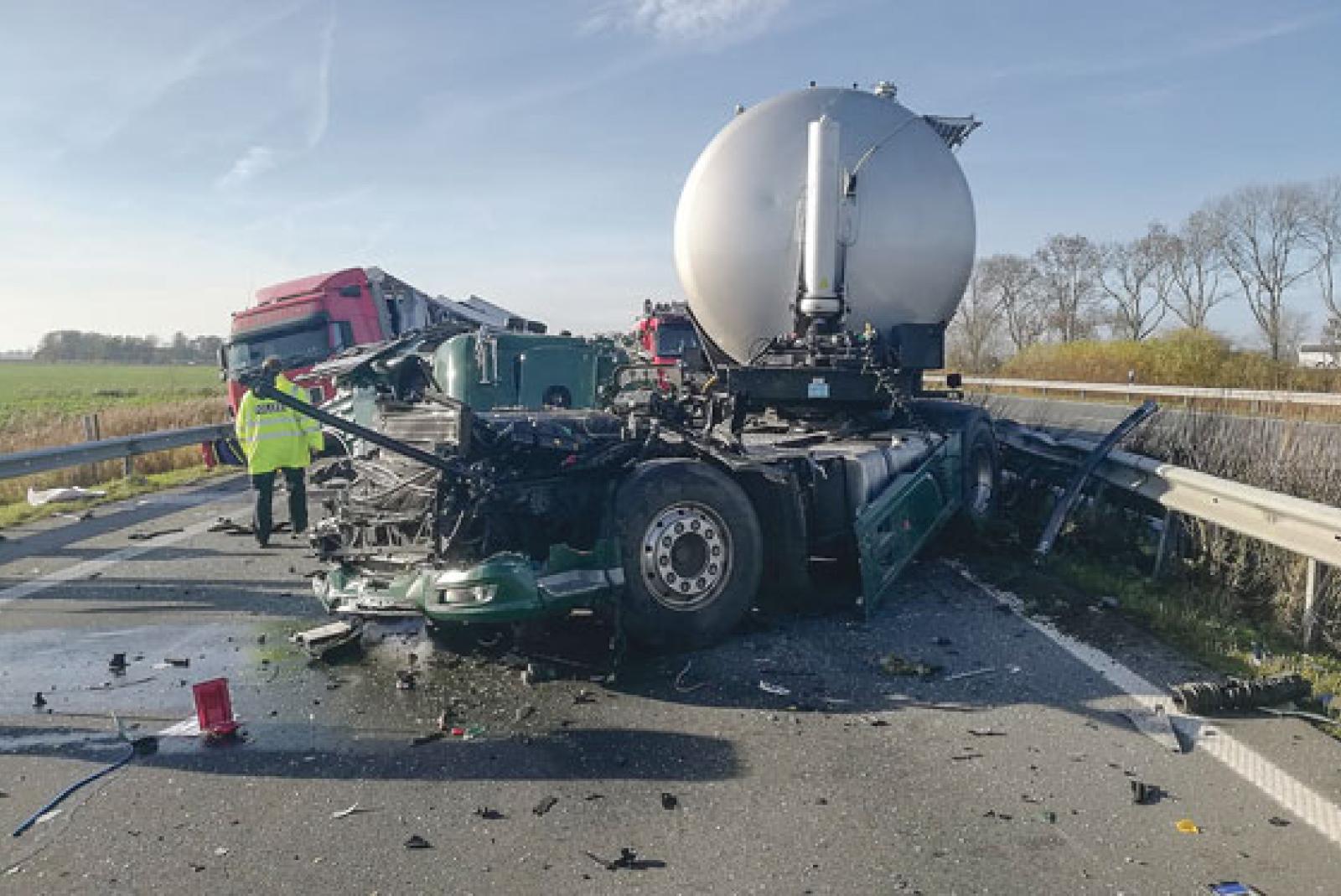 Nach ersten Erkenntnissen der Polizei stand wenige hundert Meter nach dem Grenzübergang ein Sattelzug wegen eines technischen Defekts auf dem Standstreifen. Der 25-jährige Fahrer eines Tankwagens war zu diesem Zeitpunkt in Richtung des Autobahndreiecks Bunde unterwegs. Er kam mit dem Lkw aus ungeklärter Ursache nach rechts von der Fahrbahn ab und prallte gegen den dort stehenden Sattelzug. Der 60-jährige polnische Fahrer des Sattelzuges befand sich während der Kollision außerhalb des Führerhauses. Durch den Zusammenstoß wurde der Sattelzug in die Außenschutzplanke gedrückt. Der Tankwagen prallte indes weiter in die Mittelschutzplanke. Dabei zerriss das Führerhaus, sodass es vollständig zerstört wurde.