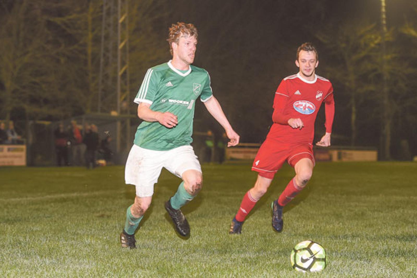 Die Fußballer des SV Teutonia Stapelmoor um den Torschützen Thomas Klinkenborg (links) kamen nach einem 0:2-Rückstand noch einmal zurück in die Partie. © Foto: Bruins
