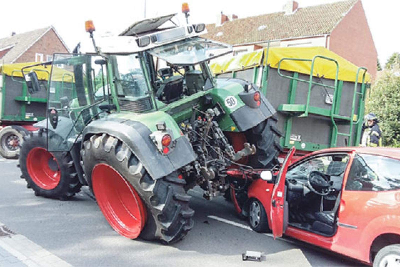 Das Unglück ereignete sich auf der Boenster Straße. Dort fuhr ein Traktor mit zwei Anhängern voller Kartoffeln in Richtung Klärwerk. Der 19-jährige Fahrer, der aus Oldenburg kommt, wollte nach Polizeiangaben an einem haltenden Auto vorbeifahren. Im gleichen Moment fuhr ein Weeneraner (48) mit einem Twingo vom Grundstück eines Seniorenheimes auf die Straße, um in Richtung Bunde abzubiegen. Dabei kam es zur Kollision mit dem Traktorgespann.