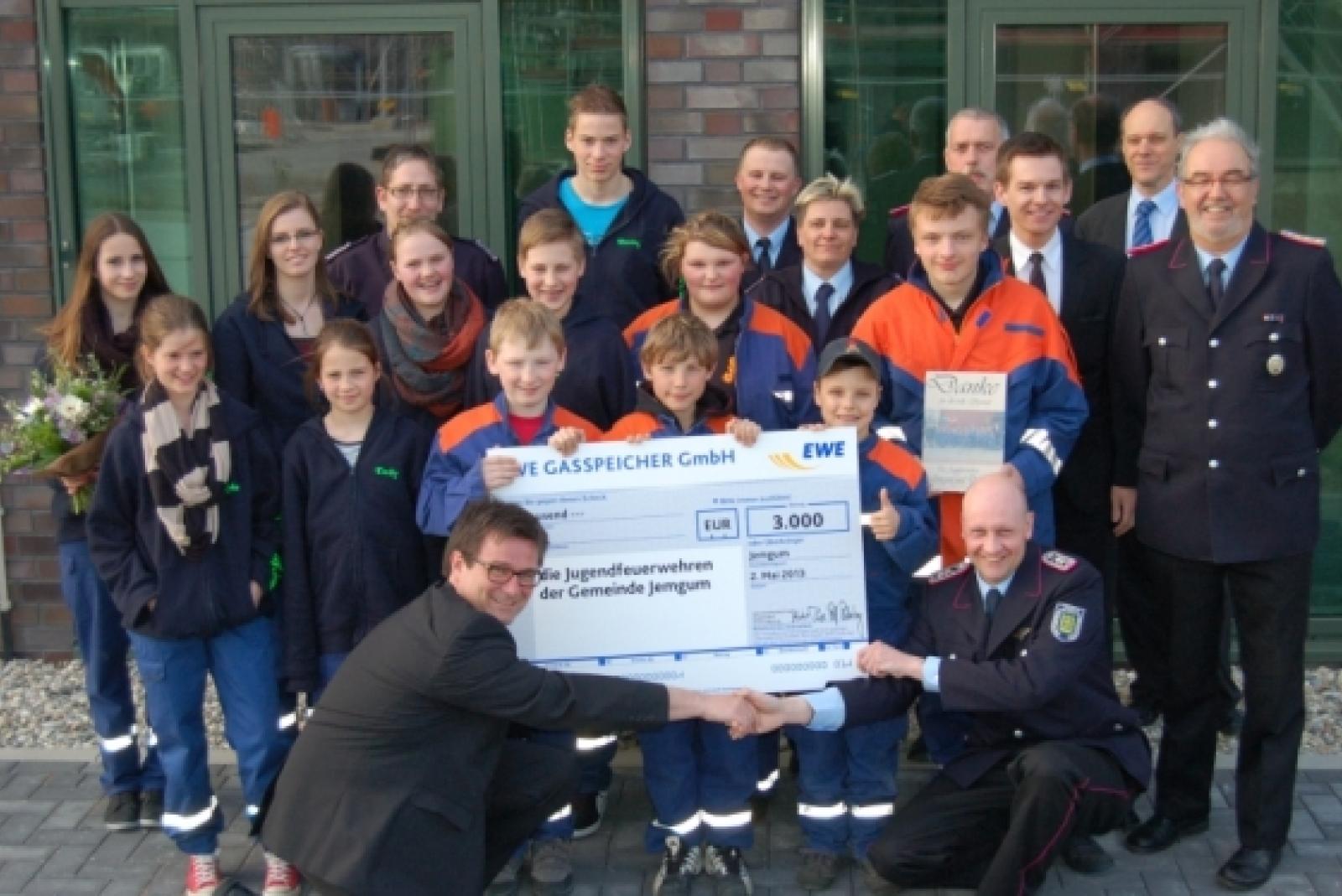 Über Eine 3000-euro-spende können sich die beiden Jugendfeuerwehren der Gemeinde Jemgum freuen. Ralf Riekenberg, Leiter der Abteilung Obertagetechnik/Solbetrieb (vorne links), übergab den symbolischen Scheck am Donnerstag auf dem Gelände des Erdgasspeichers dem Gemeindejugendfeuerwehrwart Stephan Hilbrands (vorne rechts). ...