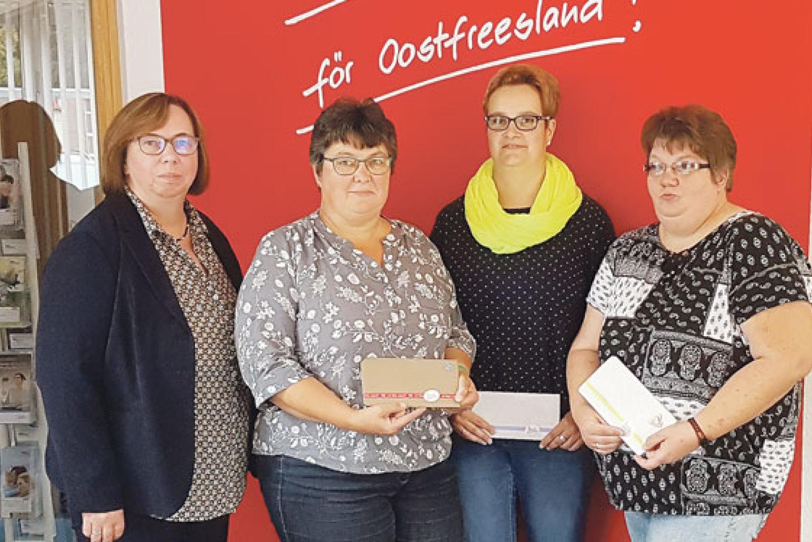 Am zweiten Familien- und Gewerbetag in Bunde wurden drei Verwöhn-Gutscheine für die Physiotherapiepraxis von Almuth Poppens-Oltrop verlost. Am Montag überreichte Hilde van Hoorn von der Ostfriesisches Landschaftlichen Brandkasse die Gutscheine an die glücklichen Gewinnerinnen. Das Foto zeigt ...