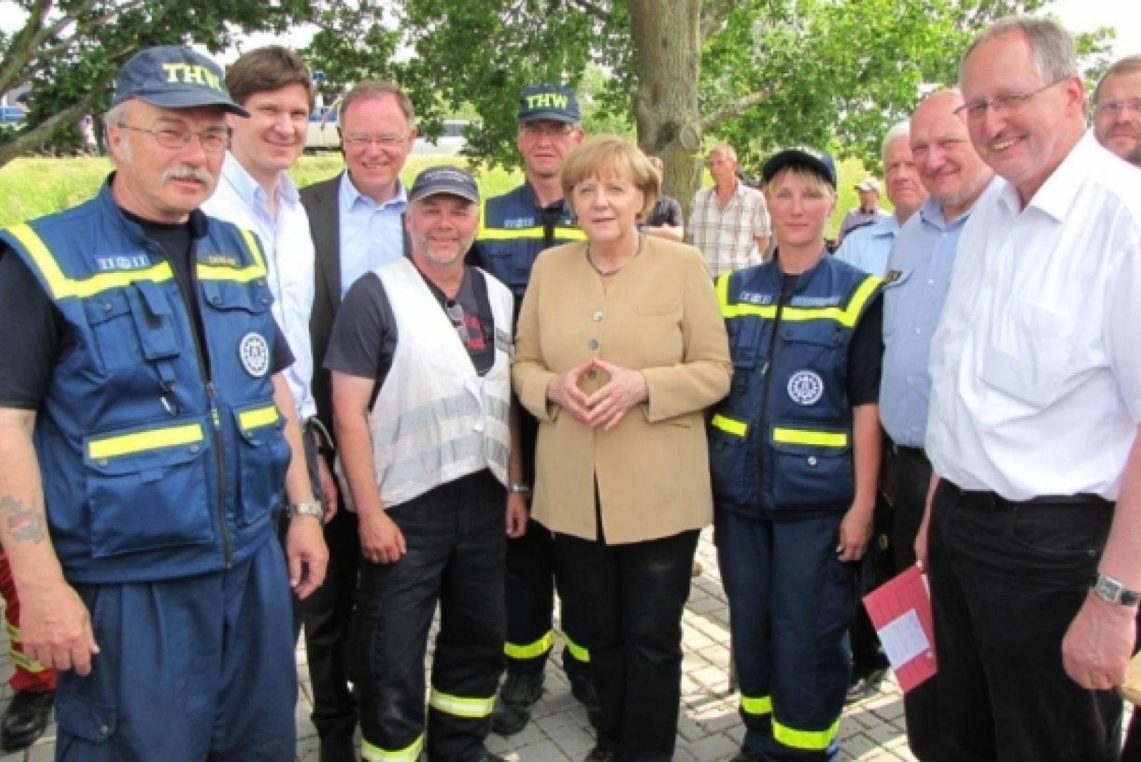 Im Hochwassergebiet in Hitzacker kam Bundeskanzlerin Angela Merkel am Mittwoch auch mit den vor Ort eingesetzten Kräften des Technischen Hilfswerkes ins Gespräch. Mitten drin mit Michael Diddens aus Möhlenwarf auch ein Rheiderländer.