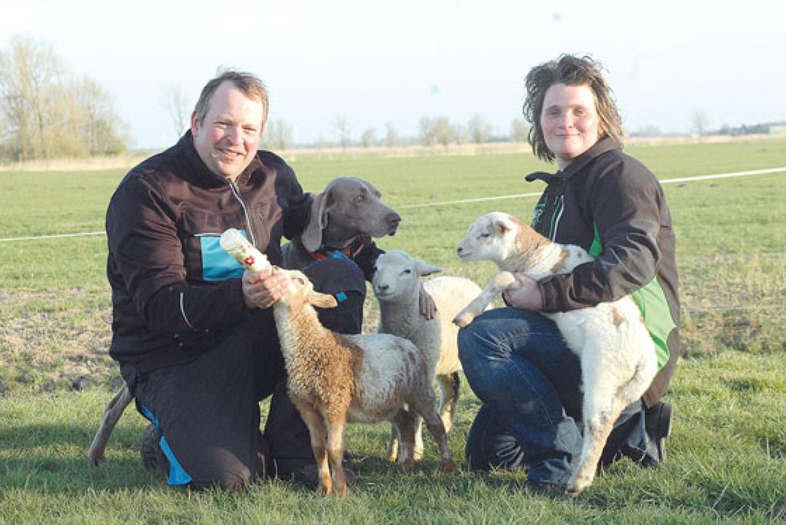 Erst einige Tage alt sind diese Lämmer, die von Hofhund »Maja« bewacht werden. Sieben Lämmer ziehen Franz-Thorsten Franz und Gunda Alberts auf ihrem Hof am Acher Weg in Oldendorp zurzeit mit der Flasche groß, weil die Mutterschafe nicht ...