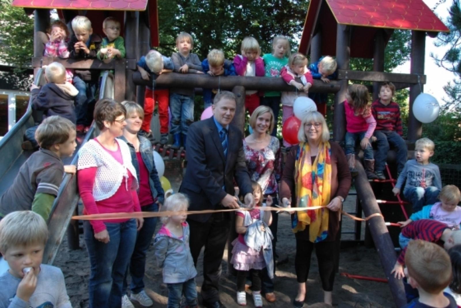 Viel Freude hatten die Kinder der Kindertagesstätte an der Lindenstraße in Bunde bei der offiziellen Einweihung des neuen Spielgerätes und der neuen Parkmöglichkeiten rund um die Einrichtung.