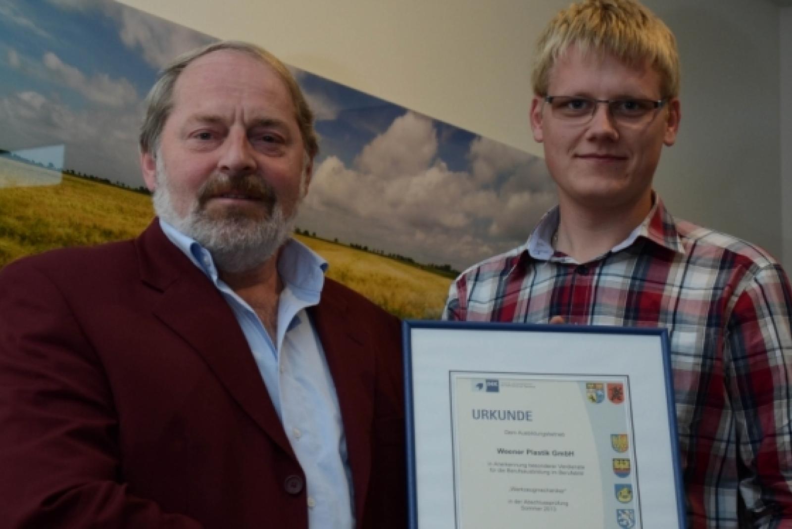 Der Werkzeugmechaniker Christan Sonnenberg aus Weener hat die Abschlussprüfung seiner Ausbildung bei Weener Plastik mit 99 von 100 Punkten abgelegt. Damit ist er von 1835 Prüflingen der Industrie- und Handelskammer für Ostfriesland und Papenburg der beste seines Abschlussjahrgangs.