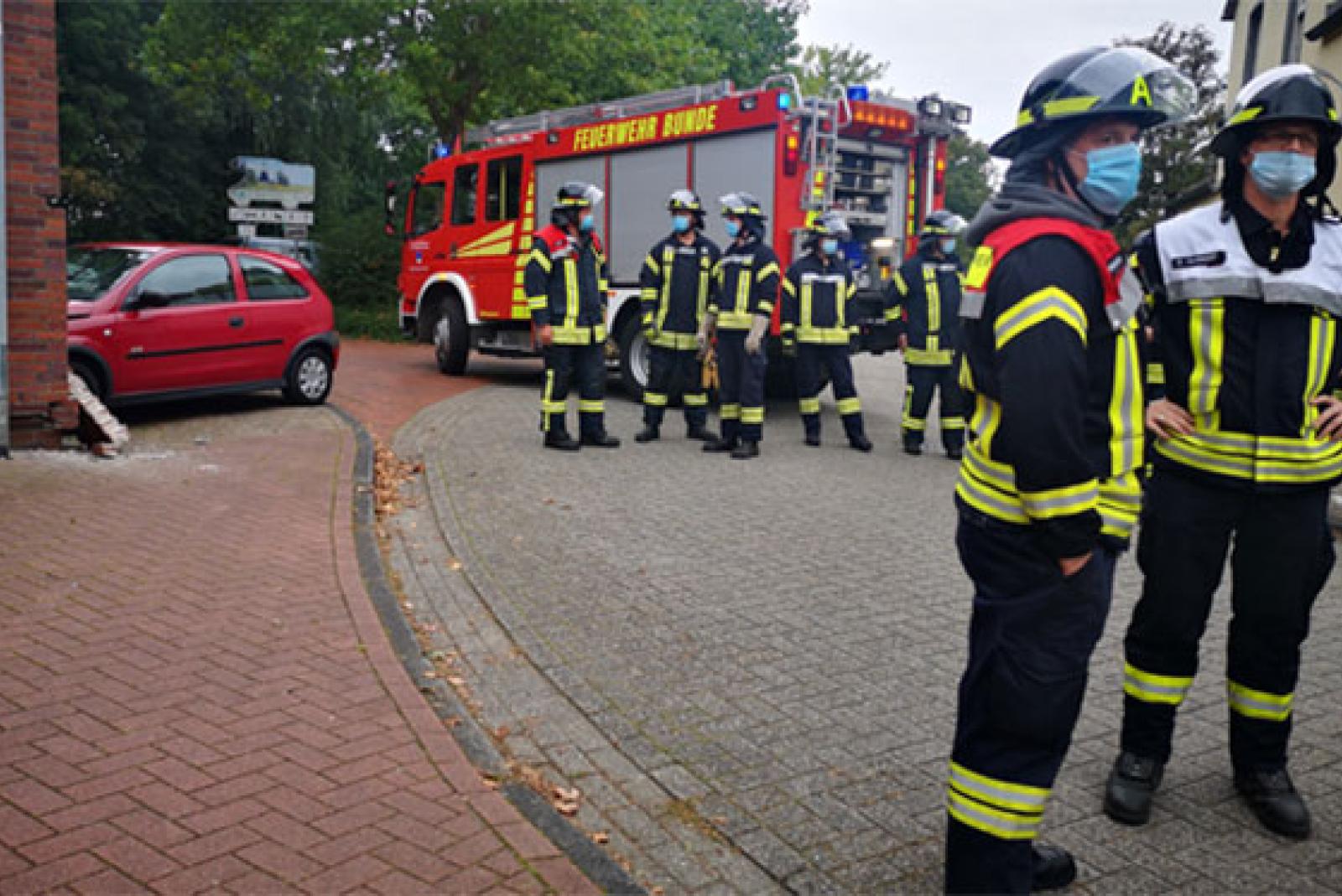 Auch Kräfte der Feuerwehr Bunde und das Technische Hilfswerk (THW) waren am Unfallort in der Nähe des Wohnmobilstellplatzes im Einsatz. Die Feuerwehr übernahm die ersten Sicherungsmaßnahmen an der Wand und streute auslaufende Betriebsstoffe ab. Durch den Einsatzleiter wurde dann das THW aus Leer angefordert, das die Garagenwand abstützte.