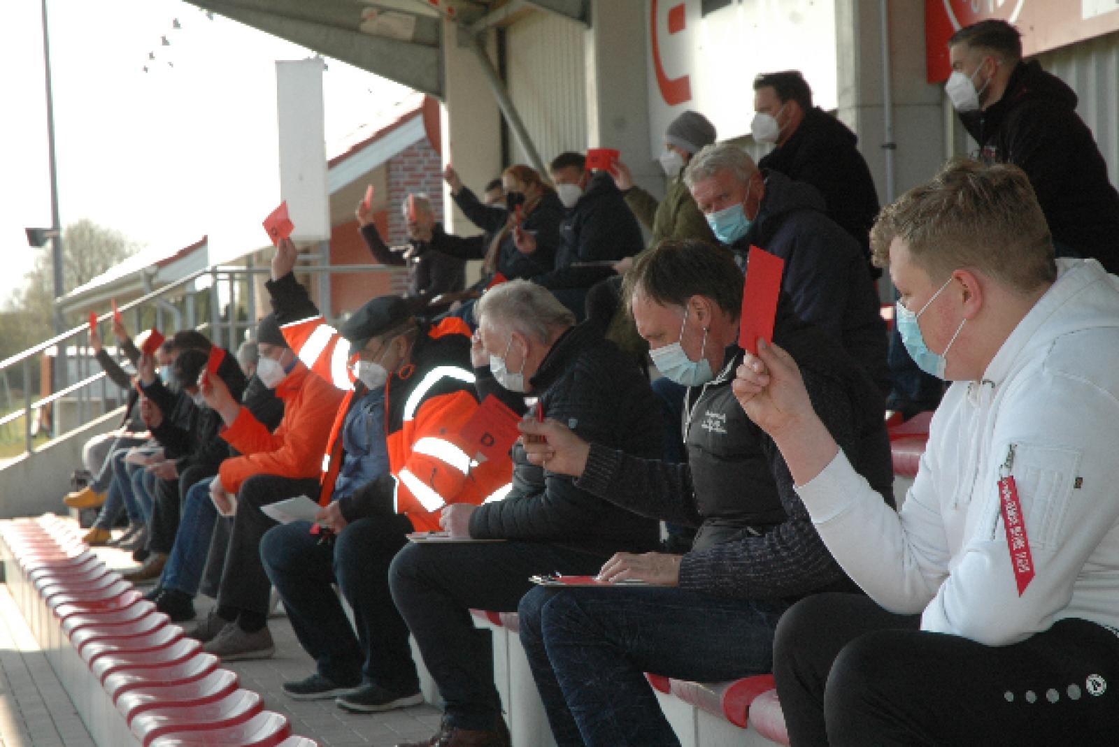 Kandidaten-Kür der Bunder SPD für Bürgermeisterwahl unter Corona-Bedingungen: Delegierte mit Masken und Abstand auf Stadion-Tribüne