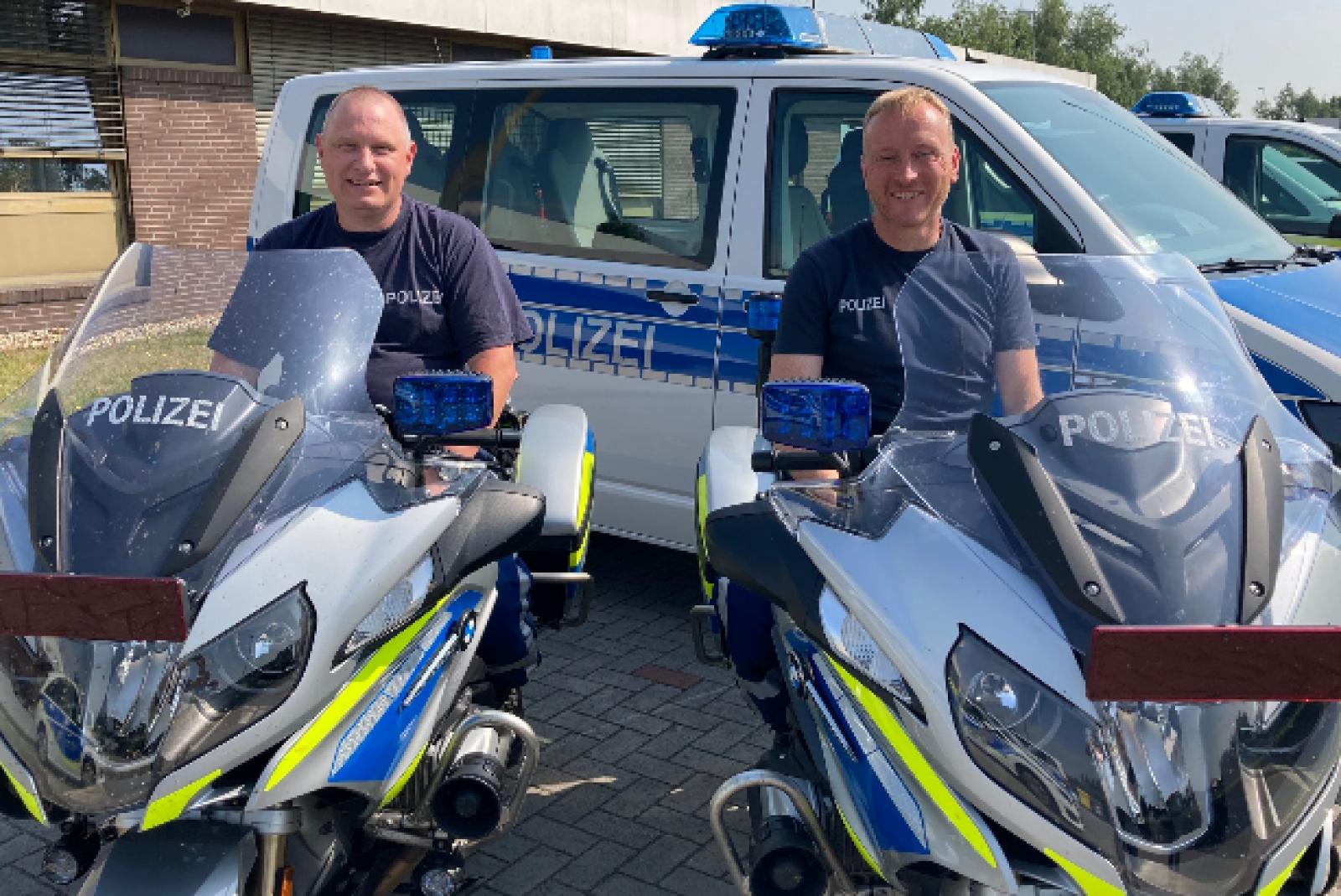 Die Bundespolizei, mit ihrem Revier an der Autobahn in Bunderneuland, hat auch zwei Motorräder im Einsatz. Mit den ps-starken Maschinen sind Joachim van Vügt und Markus Wildermann unterwegs und ziehen auch viele Blicke auf sich.