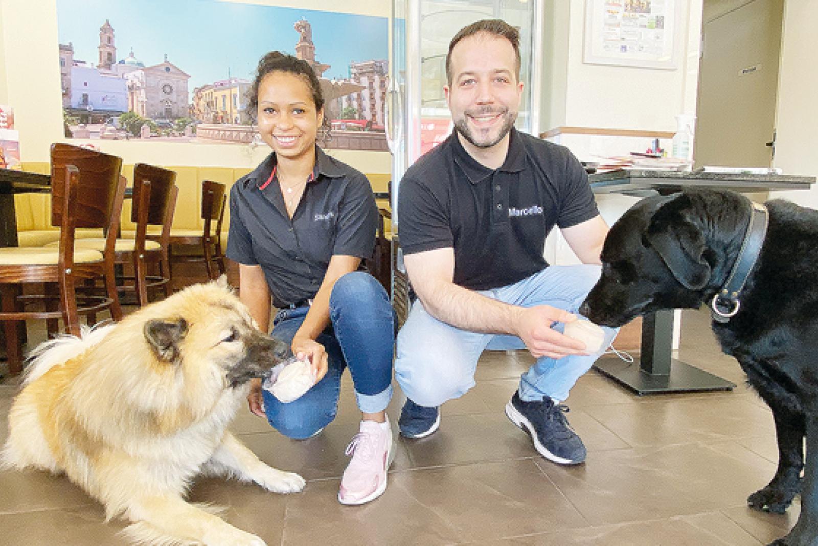 Jetzt geht´s um die Wurst im Eiscafé Mola: Sandra und Marcello Giampetro servieren ihren »Haus-Hunden« Dexter und Oskar das neue Hunde-Eis. © Foto: Hanken