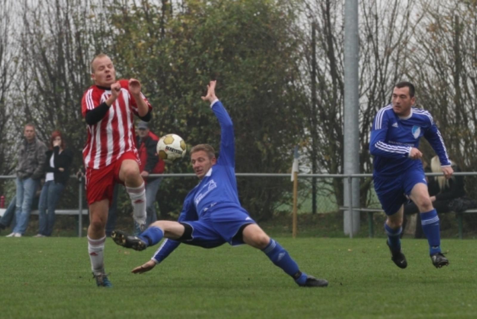 Obwohl Verlaat die alten Haudegen wie Stefan Krüger (beim Fallrückzieher) aufgeboten hatte, ging das Derby gegen Aufsteiger Jemgum II (links: Alwin Mühlena) mit 1:4 verloren. Alexander Jochum kann in dieser Szene nicht mehr eingreifen. © Foto: Schulte