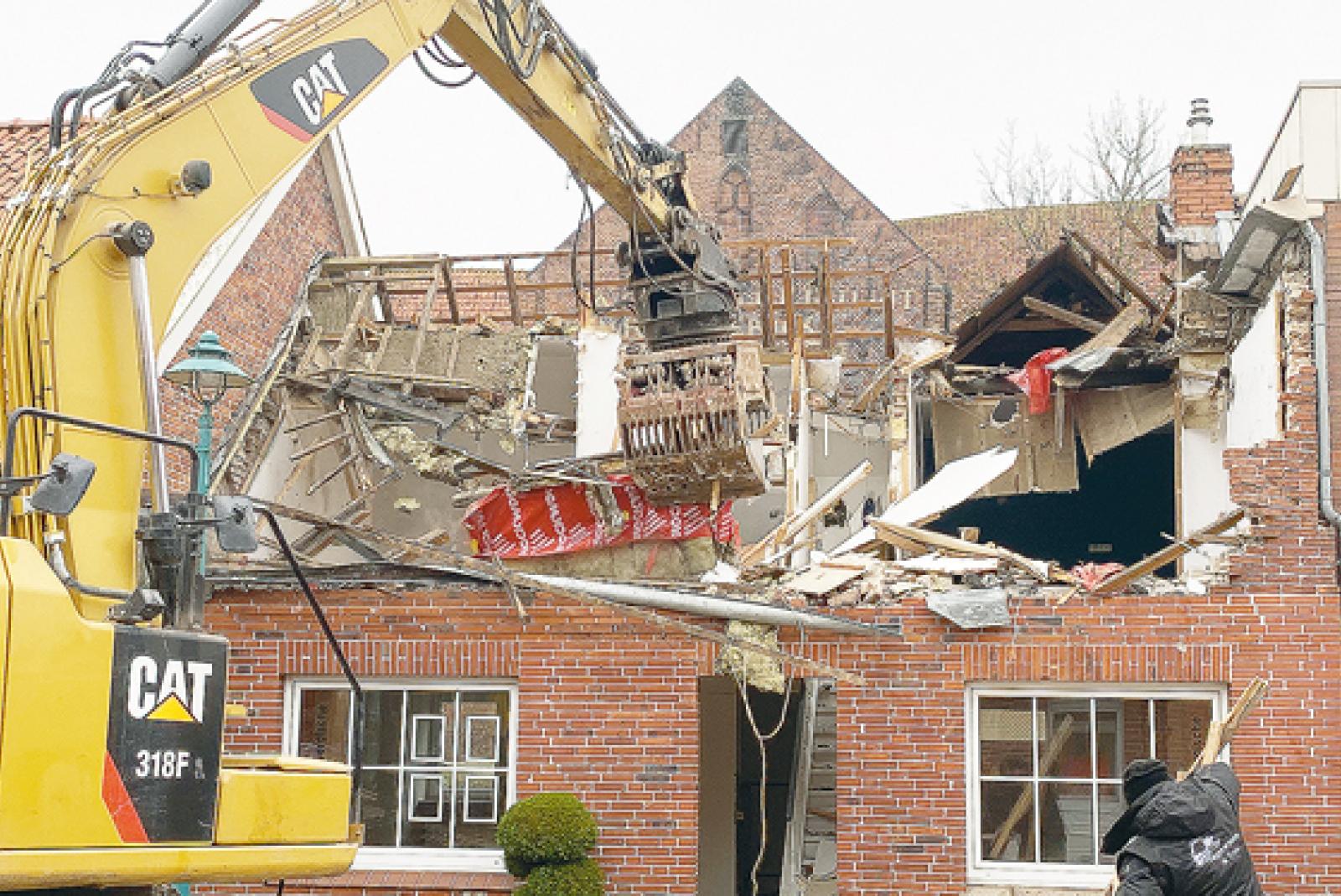 Mit der Präzision eines Herzchirurgen hat der Baggerfahrer der Firma Rose aus Wymeer gestern den Abriss des Hauses Kirchring 38 in Bunde vollzogen. Bei der »Operation« war viel Fingerspitzengefühl gefragt, um die angrenzenden Nachbarhäuser nicht zu beschädigen. <...