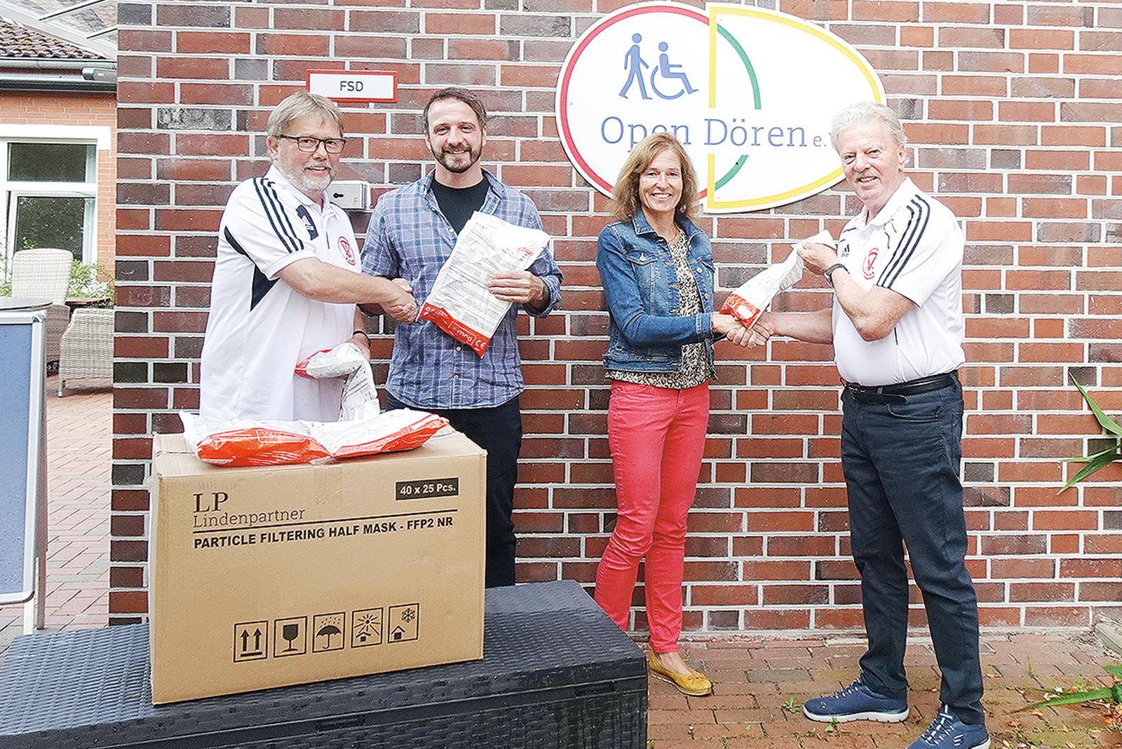 Wilhelm Timmer (links) und Reinhard Borchers (rechts) vom TV Bunde übergaben jetzt 750 FFP2-Masken an Marc Hilbrands und Insa Franzen vom Verein »Open Dören«. Der TV Bunde hatte an der Aktion »Wir wollen euch helfen, weiter zu helfen« der ...