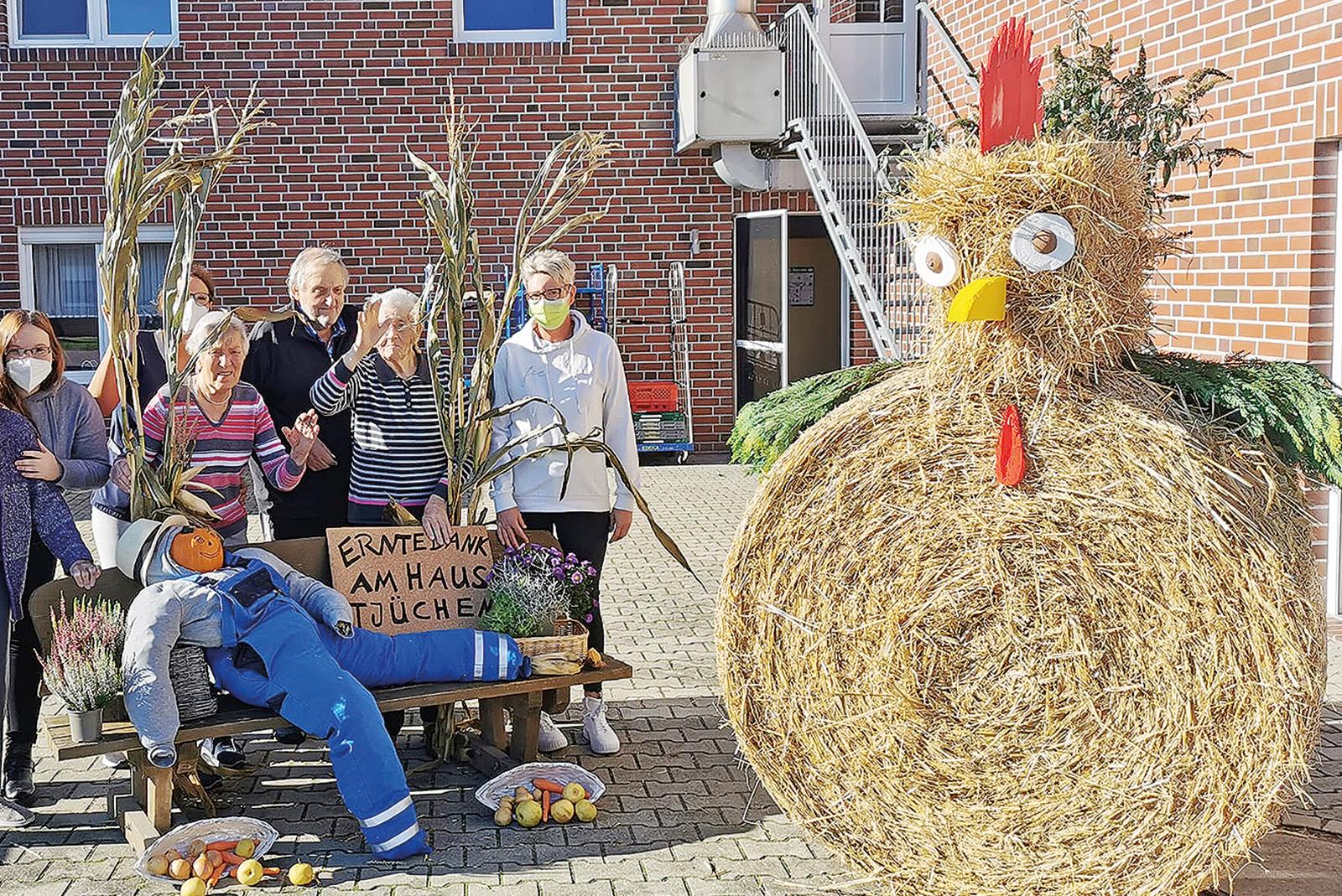 Das »Lebenshuus« im Haus Tjüchen in Bunde feierte wie jedes Jahr mit seinen Bewohnerinnen und Bewohnern das Erntedankfest. Dieses Jahr gestalteten und dekorierten sie gemeinschaftlich zwei Figuren, deren Anblick allen viel Freude bereitete. »Der Strohballen für das Huhn ...