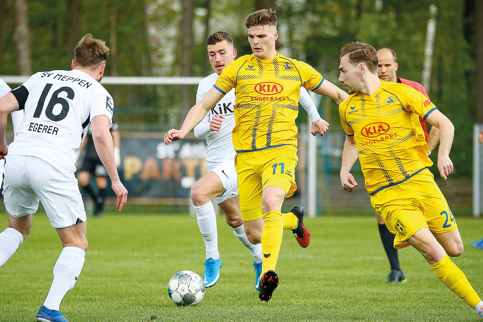 Im April 2021 spielte Marek Janssen (Mitte) für Atlas Delmenhorst im Niedersachsen-Pokal noch gegen den SV Meppen. Nun steht im Raum, dass der 25-Jährige bald sein Lohne-Trikot gegen das der Emsländer tauscht. © Foto: Born