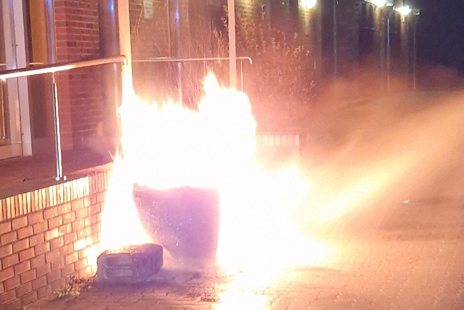 Der Blumenkübel vor dem Eingang zum Mölenland-Bad stand lichterloh in Flammen.