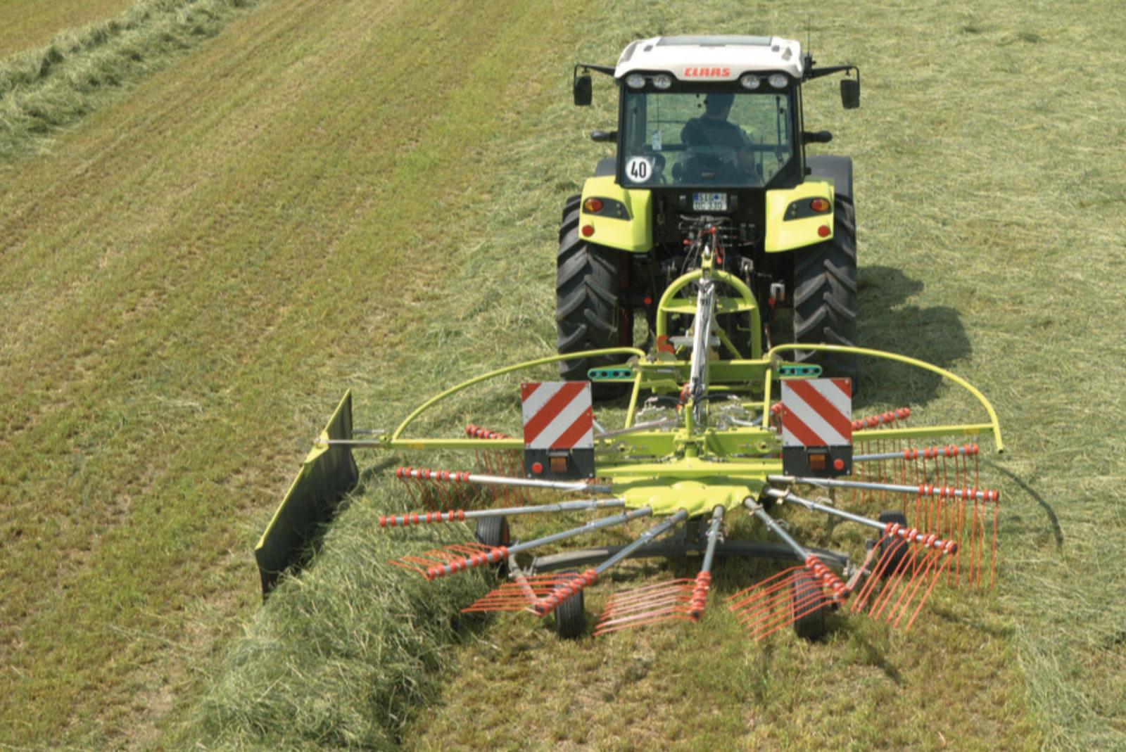 Ein Mittelschwader wird in der Landwirtschaft zum Zusammenfassen von Erntegut wie Heu oder Stroh verwendet.