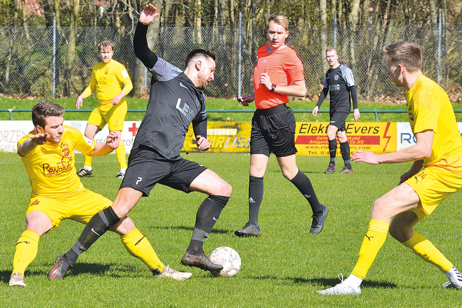 Viktor Knoll (am Ball) und Blau-Weiß Papenburg fanden in der Offensive keine Lösungen um den in gelb gekleideten Rotenburgern gefährlich zu werden. © Foto: Born