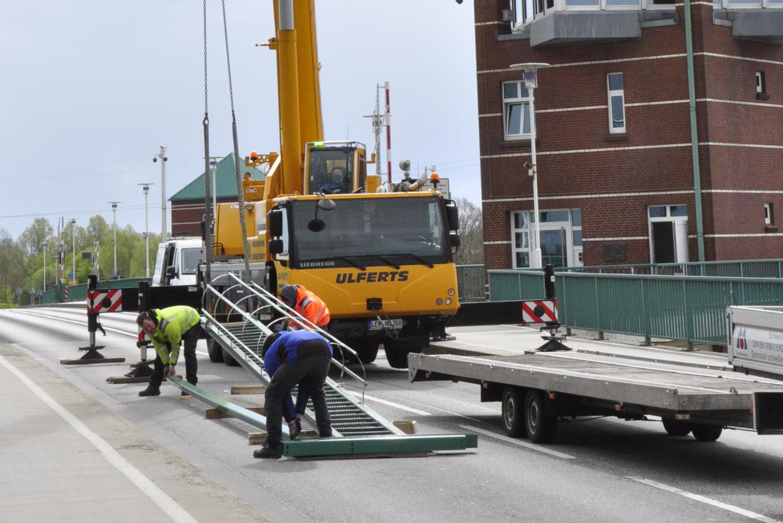 Die Jann-Berghaus-Brücke im Zuge der B 436 ist seit heute Vormittag für den Kraftverkehr gesperrt. Der Grund sind Kranarbeiten zur Installation einer Steigleiter am Brückenwärterhaus. Über diese Notfalltreppe sollen die Brückenwärter zum Beispiel beim Ausbruch eines Feuers den Turm verlassen können. Die Vollsperrung sollte nach bisherigen Angaben der Landesbehörde für Straßenbau und Verkehr bis 12.30 Uhr andauern.