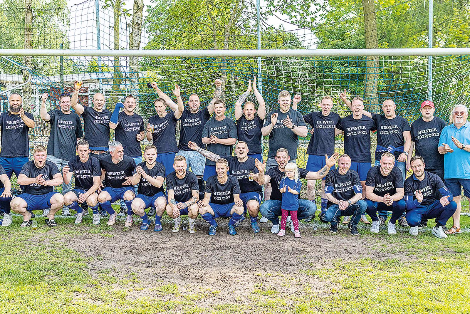 Die Meistermannschaft des TuS Holthusen erfährt jede Menge Unterstützung von außen. Nach dem 1:0-Sieg gegen den SV Ems Jemgum II ist ihr der erste Platz in der Ostfrieslandklasse D4 nicht mehr zu nehmen. © Foto: Jungeblut