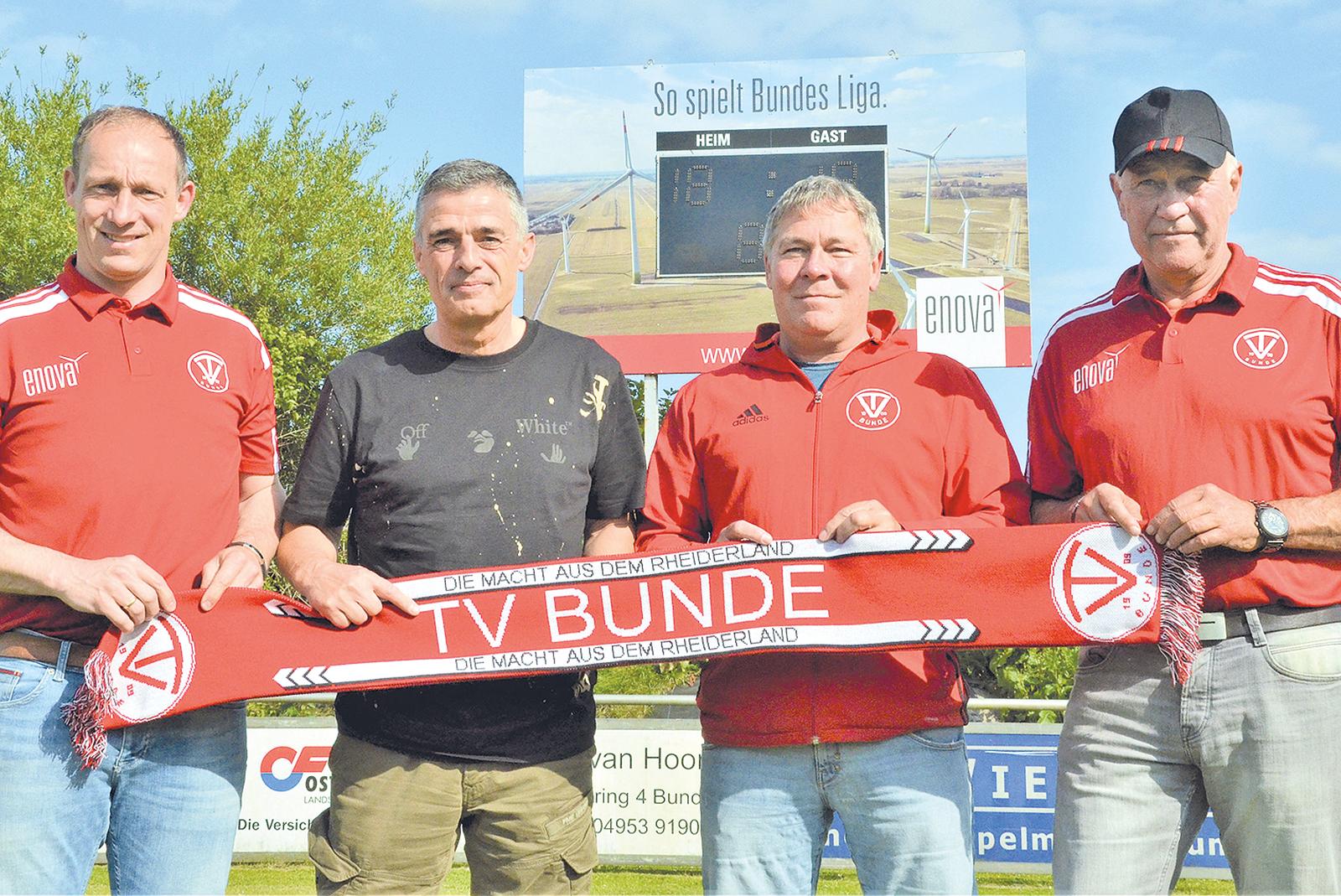 Bernhard Lübbers, Leiter der TV-Fußballabteilung (links)und Team-Manager Dieter Gelder (rechts) freuen sich gemeinsam mit dem Co-Trainer Ralph Schmidt (Zweiter von rechts) über den neuen Trainer der 1.Herren des TV Bunde, Frank Winkler.  © Foto: Ammermann