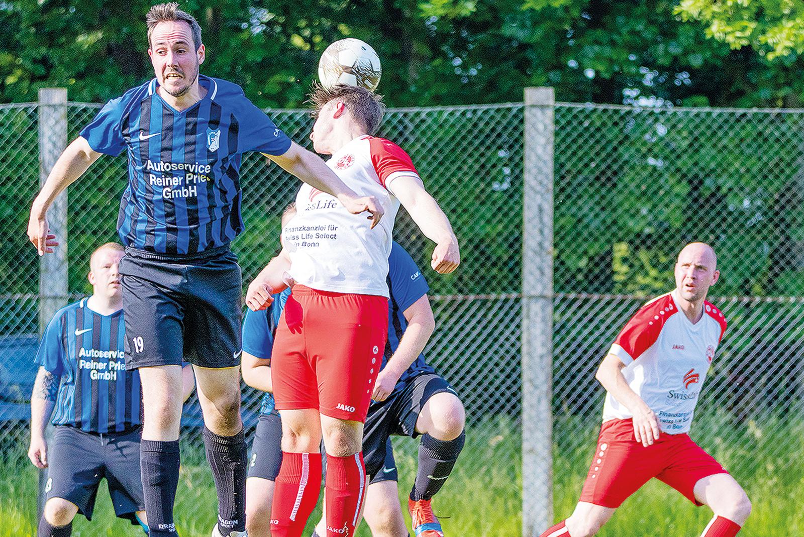 Michael Dreesmann (in der Luft) und der Heidjer SV verloren nicht nur dieses Luftduell, sondern auch das Spiel gegen die Spielgemeinschaft SC 04 Leer/Heisfelde II.  © Foto: Jungeblut