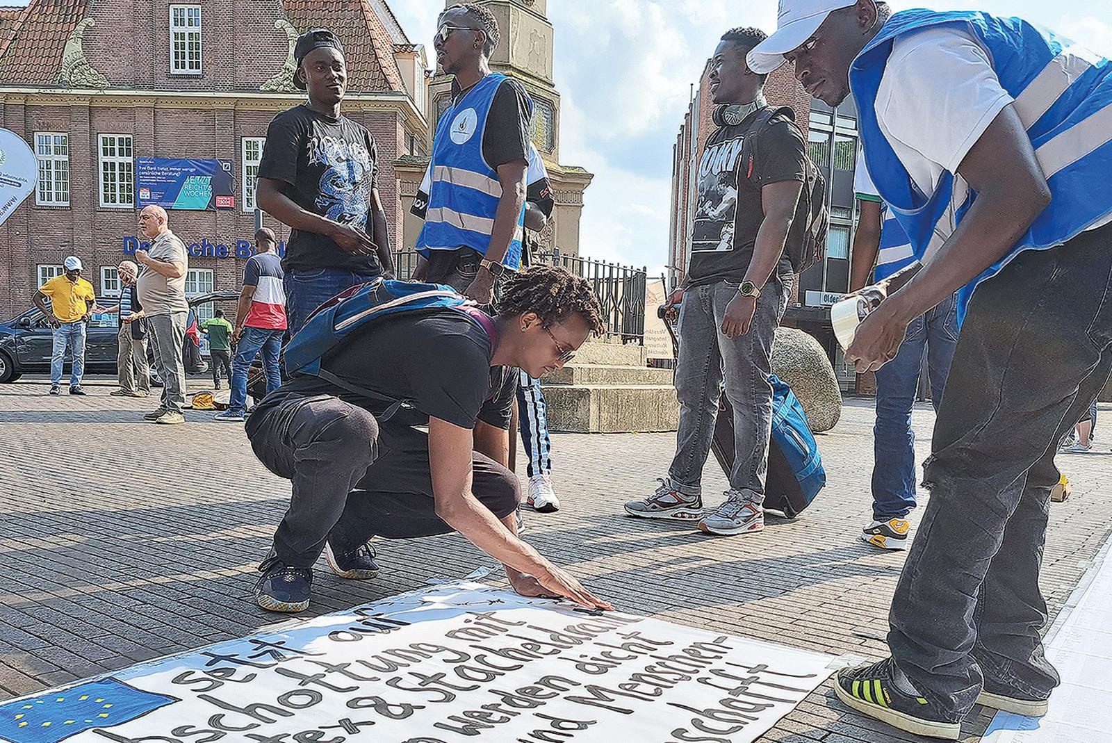 Anlässlich des Weltflüchtlingstages haben heute Nachmittag gut 100 Menschen unter dem Motto »Für das Recht auf Schutz für alle Menschen« auf dem Denkmalsplatz in Leer demonstriert, darunter einige Siebtkl&...