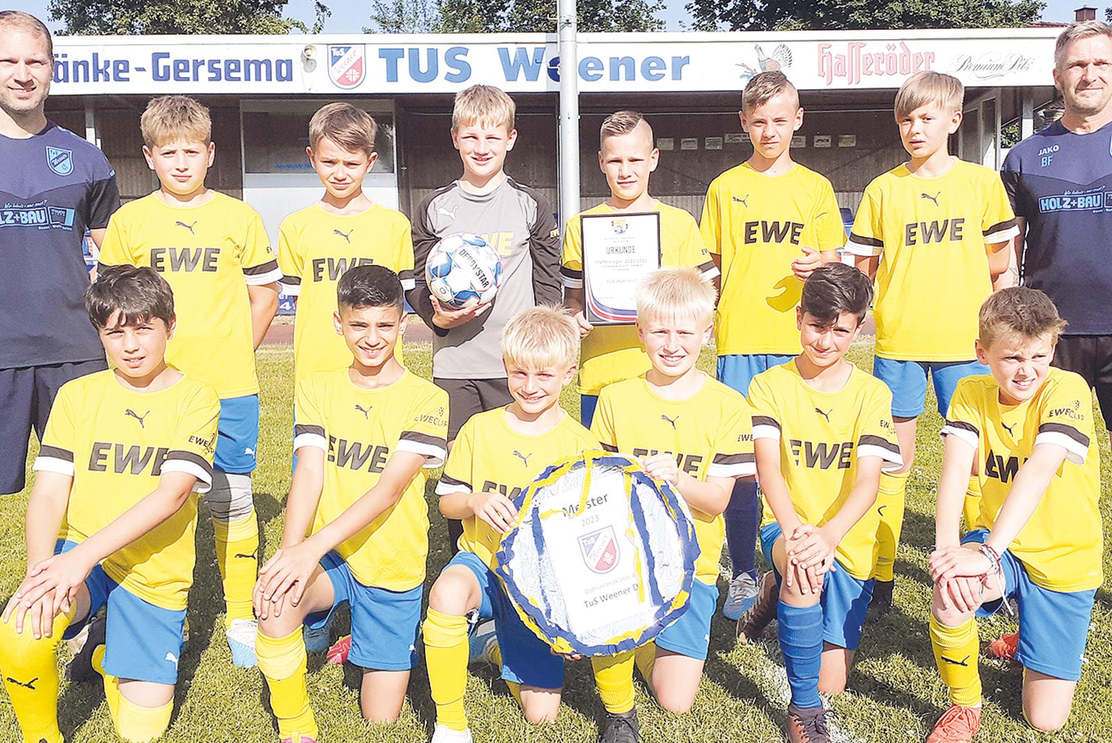 Sie haben es geschafft: Die D-Jugend-Kicker des TuS Weener II sind frisch gebackene Meister der Ostfrieslandklasse B. In einer Staffel mit dem JFV Leer II und III, der JSG Möhlenwarf/Wymeer und dem SV SuS Steenfelde konnten die Weeneraner ...